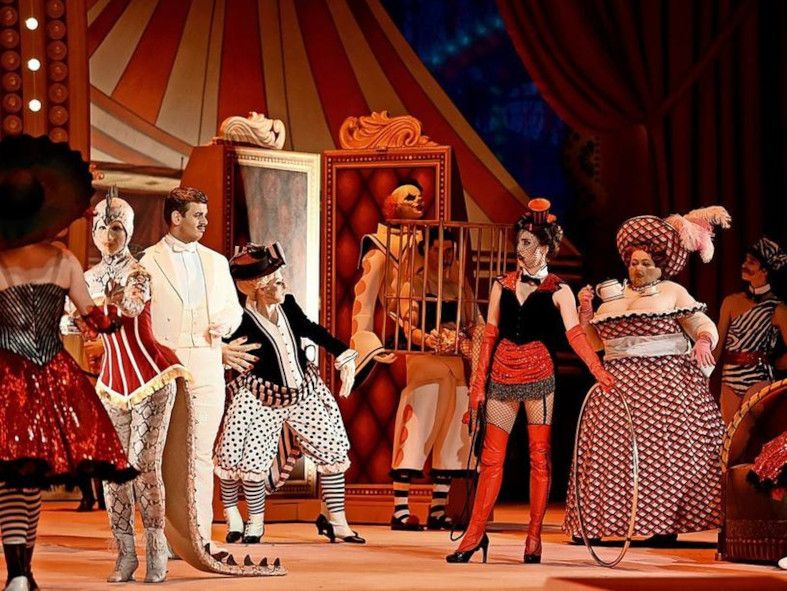 Für Orlofskys opulentem Ball gab es zusätzlich noch eine Freitreppe, die Rosalinde für ihren großen Auftritt herunter schreitet. Dieser Akt lebt hauptsächlich von den zahlreichen illustren Gästen Orlofskys: Tänzer, Clowns, Akrobaten, Mono-Wheel-Artisten, Harlekin, Bajazzo, ein Schlangenmensch, üppige Damen mit Bart, ein Tanzbär – eigentlich gibt es hier alles was man vom Varieté, vom Karneval in Venedig, Rio oder vom Cirque du Soleil her kennt. Geschaffen haben diese schrill-bunte, herrlich gewollt kitschige Produktion - mit Engeln, Putten, Herzen und viel rosarot, dazu bunte phantasievolle Kostümkreationen - André Barbe und Renaud Doucet, dem Hamburger Opernpublikum bereits bestens bekannt durch ihre wunderschönen Inszenierungen von Rossinis La Cenerentola und Offenbachs La belle Hélène. Regie, Bühnenbild, Kostümentwürfe und Choreographie lagen wieder in ihren bewährten Händen. Es war wohl ihre Intention, ein Eheleben - „Szenen einer Ehe“ - darzustellen, vom Anfang bis zum Ende, mit Höhen und Tiefen, Flirts, Krisen und Untreue.
