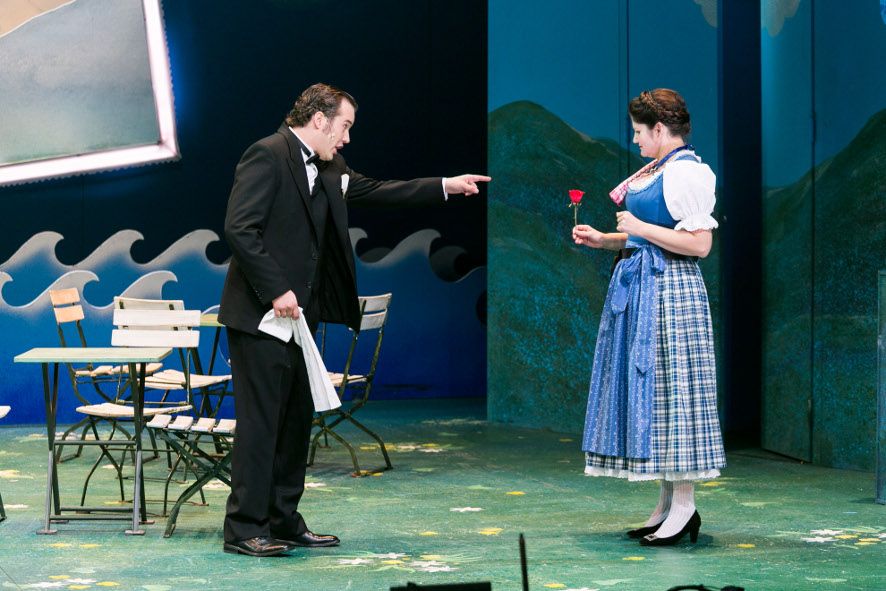 Joseph Köpplinger ist Österreicher; seine Inszenierung am Gärtnerplatztheater zieht alle Register der österreichischen Sommerfrische: Nächster Urlaub am Wolfgangsee! Auch das Berlinerische kommt nicht zu kurz, wenn der Trikotagen Fabrikant (Erwin Windegger) von der Ostsee schwärmt und das bitte, im Urlaub am schönen Wolfgangsee: Diese Sprachschmankerl sind wunderbar, pointiert komödiantisch herausgearbeitet, große Unterhaltung. Alles kommt so in Köpplingers Inszenierung zusammen: feinfühliger Humor, dazu Gefühl und Liebe wie klamaukiger Kitsch: Die wesentlichen Ingredienzien einer packenden Operette.Michael Brandstädter spielt mit dem Orchester des Gärtnerplatztheaters lebendig auf. Es ist sein Abend, in der vor 80 Jahren geschaffenen Urfassung gespielt etwas jazzig, mit vielen Schlagern aber doch gefühlvoll. Mit Tempo verzaubert Brandstädter mit den so populären Lieder, ihrem Frohsinn und Charme das Publikum. Für alpenländliches Urlaubsgefühl sorgt das Bühnenbild von Rainer Sinell, der auch die Kostüme kreierte. Österreichische Tracht und Berliner Schick der 20er Jahre: dies allein hat schon seinen besonderen Reiz. Ein schiefhängendes großes Bild im Bühnenhintergrund zeigt beständig buntes Alpenpanorama. Vor diesem Bild wird geschuhplattelt und gejodelt (Choreographie Frank-Oliver Weißmann). Nicht zu vergessen die Blaskapelle, die Wandergruppen und die herrliche Bestuhlung des Gastgartens des Weißen Rössl: bei belegten Brötchen gab es dort einen schräg kitschigen Blick auf den von Wellen bewegten See und die Berge. Um das einmalig schöne Balkonzimmer streiten sich die Gäste lauthals. Letztlich bekommt das Zimmer … Wer? Natürlich der Kaiser. Der blaue Himmel wird dann vom Schnürlregen abgelöst. Gießkannen demonstrieren den Schnürlregen, den es - alle Welt weiß es - nur und oft im Salzkammergut gibt..