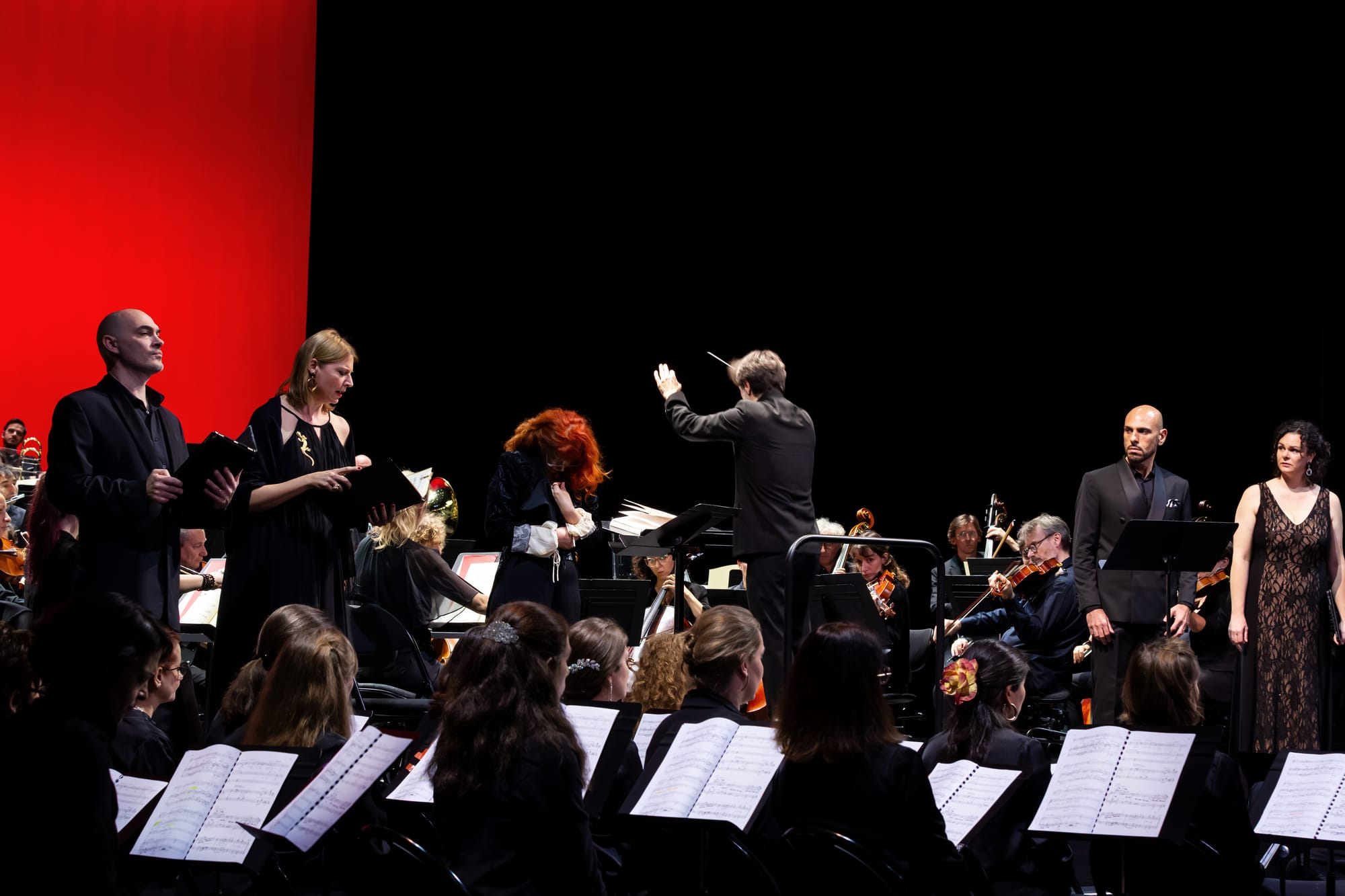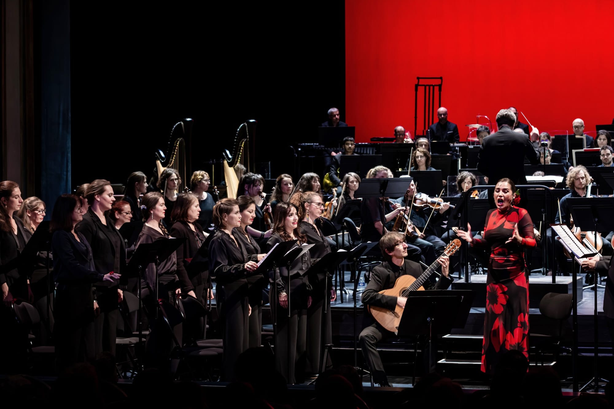 Die gleiche Ästhetik findet sich in La Vida breve, es ist ein zwar kurzes, aber sehr intensives Werk. Wie in El Amor brujo spielt die Handlung in der andalusischen Roma-Welt. Der Flamenco durchdringt de Fallas Partitur und verwebt sich mit der lyrischen, an Giacomo Puccini (1858-1924) erinnernden Kompositionen. In der Rolle der Salud verkörpert die französische Sopranistin Patricia Petitbon eine schmerzliche Melancholie mit einem langgezogenen Gesang, der an den Cante Jondo erinnert. Ihre Stimmführung ist klar und klangvoll, mit einer hauchigen Note, die der Rolle gut steht. Sie spielt sehr engagiert und ausdrucksstark. An ihrer Seite singt der spanische Tenor Carlos Natale. Der Sänger singt die Rolle des Paco zurückhaltender! Allerdings muss man sagen, dass er wenige Einsätze hat und seine Stimme in der Tiefe etwas gedämpft klingt, obwohl die Höhe klar und deutlich ist. Roch tritt in der Rolle der Abuela, deren Gesangslinie an eine Altstimme grenzt, deutlich hervor. Auch hier beweist sie ihre Souveränität in diesem Repertoire! Der französische Bass Jean-Luc Ballestra als Sarvaor ist ebenfalls in exzellenter, kraftvoller und sogar bedrohlicher Form. Die französische Mezzo-Sopranistin Sophie Belloir, die Saluds Rivalin Carmela verkörpert, präsentiert in ihrem kurzen Auftritten einen frischen und angenehm lebendigen Gesangsstil. Der Höhepunkt des zweiten Akts bietet schließlich die Gelegenheit, echten Canto Jondo zu erleben, vorgetragen von der spanischen Cantaora Laura Gallego Cabezas, begleitet von dem ausgezeichneten französischen Gitarristen Hervé Merlin, Mitglied des Orchesters. Wir erleben ein tiefgründiges, ergreifendes Lied, an die Grenzen der Stimme getrieben, mit herzzerreißenden Vokalisationen. Die Sängerin erntet gewaltigen Applaus vom Publikum! Und das wohl berechtigt! Die übrigen Rollen werden äußert phantastisch und professionell von den Solisten des Chors der Opéra Angers Nantes verkörpert: Seungmin Choi, Tenor ist die Stimme des Schmieds, die üblicherweise von der Bühnenseite aus erklingt. Daher singt er leise , aber mit exzellenter Tragfähigkeit. Pablo Castillo Carrasco, Bariton als Manuel, der Bruder der Braut, überzeugt mit Ausdrucksstärke, klarer und präziser Phrasierung. Auch Florencia Machado als Erste Verkäuferin, Evelyn Vargara als Zweite Verkäuferin, Hélène Lecourt als Dritte Verkäuferin, Sung Joo Han als Stimme des Verkäufers und Carlos Torres Montenegro als Eine Stimme im Hintergrund leisten in kürzeren und schwerer verständlichen Partien hervorragende Arbeit. Der von dem französischen Chorleiter Xavier Ribes einstudierte Chor überzeugt mit einer bewundernswerten Leistung, starken Sängern in jeder Stimmgruppe und großem Zusammenhalt. Die Raumaufteilung verhindert allerdings eine räumliche Anordnung – einige Interventionen des Chors sollen hinter der Bühne oder in der Ferne stattfinden, was hier offensichtlich nicht möglich ist – der Vorteil besteht jedoch darin, dass alles klar und deutlich hörbar ist und sich auf der gleichen Ebene befindet.