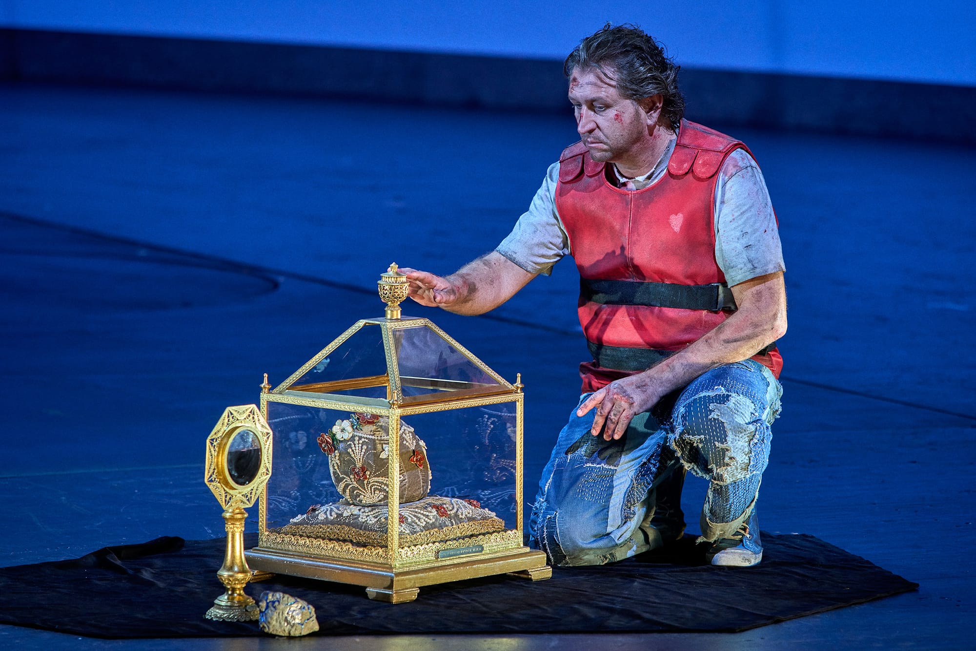 Wagners Parsifal ist nicht selbsterklärend, er muss gedeutet werden. Die Figur des Parsifal steht für jeden einzelnen Menschen, der auf einem Weg ist. Parsifal verlässt Herzeleide, er sieht im Wald die Ritter, denen er folgt. Seine Mutter stirbt daraufhin, wie Kundry ihm später erzählt. Parsifal ist schuldlos schuldig. Das T-Shirt, das er trägt – „Remember me!“ – hat es ihm seine Mutter mitgegeben? Parsifal versteht schließlich das Leid der Herzeleide, er erkennt die Schuld am Sterben seiner Mutter. Der Gral, ein großer blauer Kristall, wird im dritten Aufzug zerstört. Damit zeigt Scheib, er ist ersetzbar. Es gibt zahllose Grale, jeder hat seinen eigenen Gral. Dieser Gral wird nicht mehr benötigt. Mit dem Hostienbehälter, der Monstranz und den anderen Reliquien zeigt Scheib Andeutungen an die christliche Religion. In dem in zahlreichen Szenen eingesetzten Live-Video zeigt Scheib, dass sich das Drama in den Gesichtern der Personen abspielt, sehr schön zu beobachten insbesondere bei Ekaterina Gubanova. Er hat die Figur der Kundry verdoppelt, es gibt eine Statistin, die als Kundry-Double in einer stummen Rolle auftritt. Sie ist die Personifikation des schlechten Gewissens von Gurnemanz und Amfortas. Amfortas sündigte mit ihr, daher hat er den Heiligen Speer an Klingsor verloren. Auch Gurnemanz hat seine Wunde, er hat versagt, als Amfortas den Speer verloren hat. Kundry ist die Zerrissene, sie ist in beiden Reichen verortet, bei den Gralsrittern ist sie ebenso zu Hause wie im Zauberreich Klingsors. Daher hat sie in Jay Scheibs Inszenierung zweifarbige Haare, schwarz und weiß, wobei sich die Intensität und das Verhältnis von schwarz und weiß ändern. Eine Traumsequenz im Vorspiel wirft die Frage auf, was ist mit Kundry und Gurnemanz? Ist es eine Phantasie von Gurnemanz, ist es ein Traum oder eine Erinnerung? Man weiß es nicht genau. Aber irgendetwas ist zwischen den Beiden.