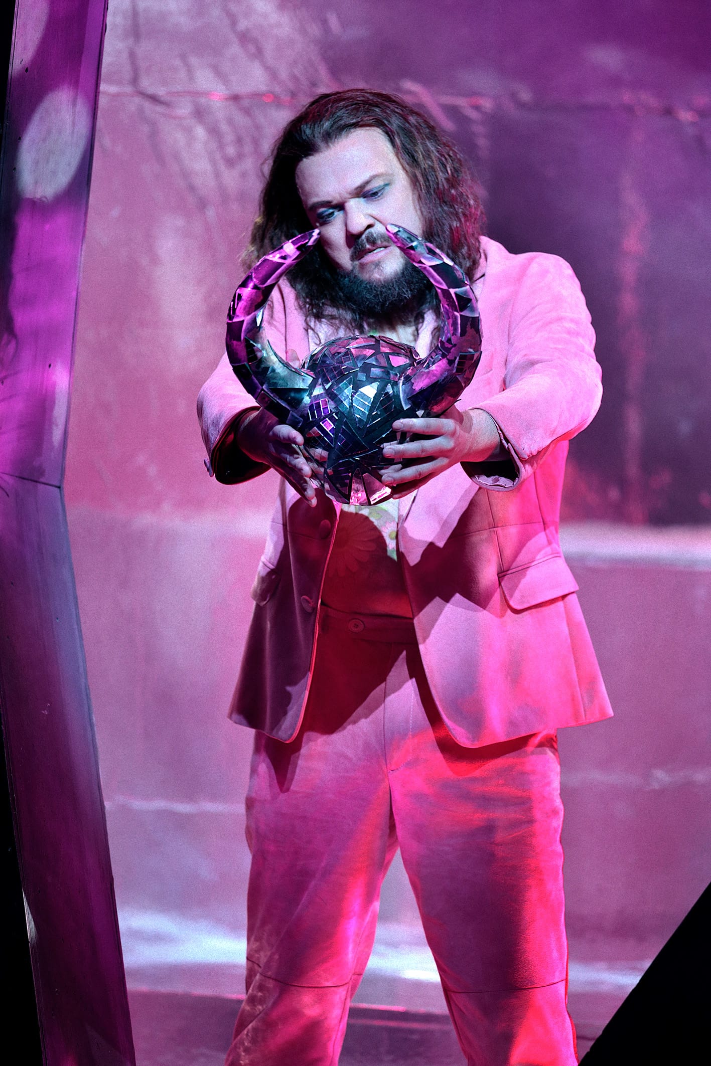 Die Spannung vor dem zweiten Aufzug steigerte sich dadurch, dass sich der Beginn zweimalig verzögerte. Das Publikum wunderte sich über die verspäteten Pausenfanfaren ebenso wie über den verzögerten Einlass. Das dürfte in der langen Geschichte der Bayreuther Festspiele auch nicht so häufig gewesen sein. Die Rezensentin erlebte das jedenfalls zum ersten Mal. Als das gespannte Publikum mit zwanzigminütiger Verspätung schließlich im Zuschauerraum Platz genommen hatte, konnte der Pressesprecher endlich verkünden, dass Herr Vogt im Festspielhaus gelandet sei und quasi gerade ins Kostüm steigt. Das Publikum kommentierte diese Ankündigung begeistert und mit dankbarem Applaus. Das Vorspiel ist lebhaft. Ein völlig anderes Klangbild leitet den zweiten Aufzug ein. In erregten Streichermotiven bildet sich das Klingsormotiv heraus. Klingsor hat sein eigenes Reich geschaffen. Die Gralsritter haben ihn aus ihrer Gemeinschaft ausgeschlossen, da er nicht keusch sein konnte. Als Strafe dafür hat er sich selbst entmannt. Nun versucht er Rache zu nehmen, indem er die keuschen Ritter in seinem Zaubergarten von erotischen Blumenmädchen verführen lässt. Klingsor (Jordan Shanahan) erscheint in einem pinkfarbenen Anzug mit Blumentattoos auf der Brust, langen schwarzen Haaren und High Heels, um ihn herum zucken Lichtblitze.