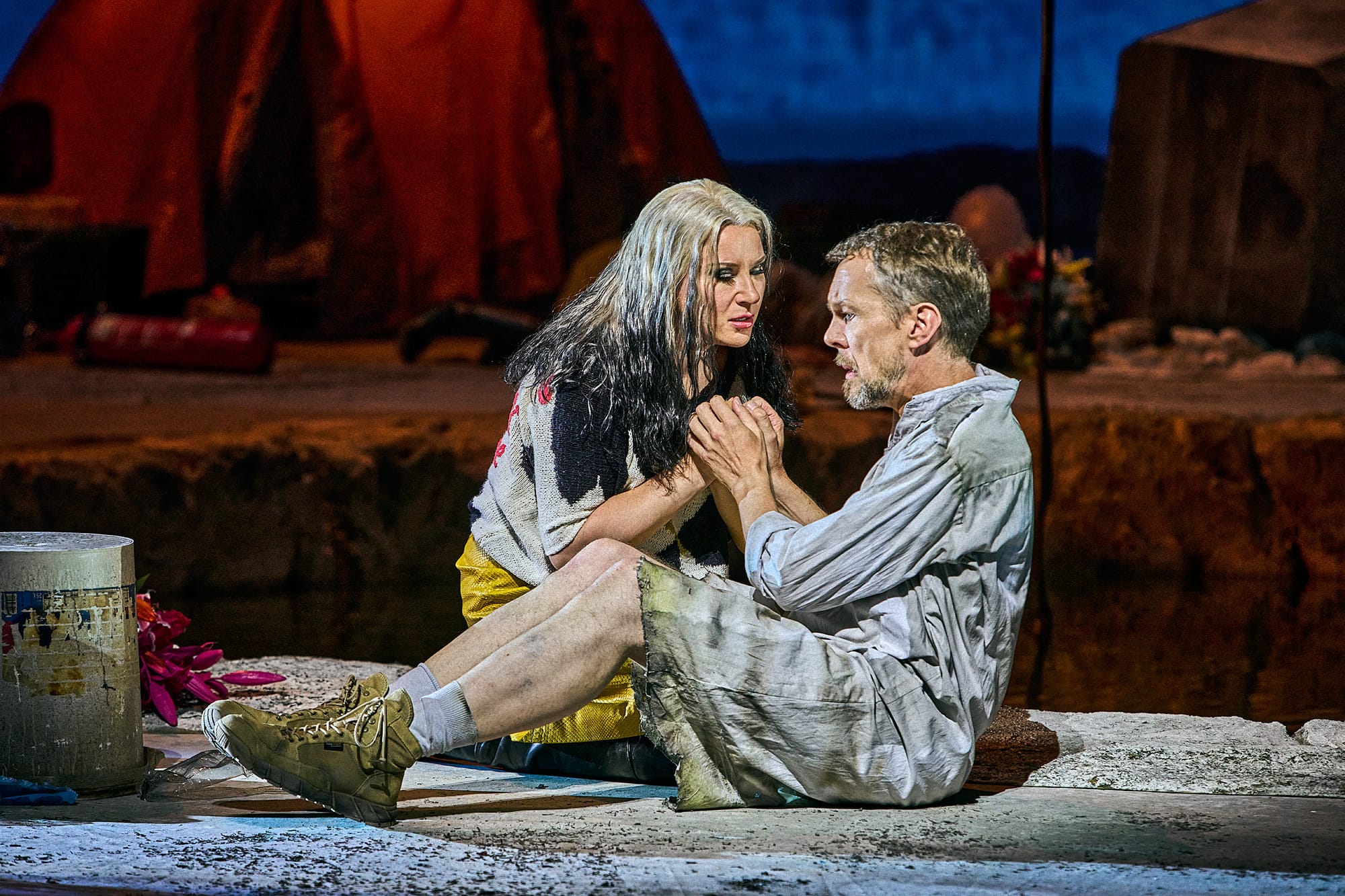 Erstaunt erfährt er von Kundry Dinge über seine Eltern. Der letzte Gruß der Mutter wird „der Liebe erster Kuss“. Beide sinken auf eine Matratze nieder, Kundry will Parsifal verführen und in diesem Moment erkennt er, was es mit der Wunde des Amfortas auf sich hat und stößt sie zurück. Die ganze Szene mit dem Ausbruch „Amfortas, die Wunde! Sie brennt in meinem Herzen“ kommt so präsent und überzeugend, als hätte Klaus Florian Vogt jede Vorstellung gesungen und käme nicht geradewegs vom Flughafen auf die Bühne. Sehr überzeugend gestaltet auch Ekaterina Gubanova die Szene, als Kundry sich daran erinnert, wie sie einst Christus am Kreuz verlachte und fleht Parsifal um Erlösung an. Schließlich erkennt Parsifal seine Bestimmung und gibt Kundry Zuversicht: „Erlösung, Frevlerin, biet ich auch dir“, wenn sie ihm den Weg zu Amfortas zeigt. Die Blumenmädchen und Klingsor kehren zurück, Klingsor bringt den Heiligen Speer. Parsifal packt den Speer und zu den Worten „Mit diesem Zeichen bann‘ ich deinen Zauber!“ zieht Heras-Casado das Orchester groß auf, die Bühne wandelt sich und Parsifal verkündet „Du weißt, wo du mich wiederfinden kannst.“ Die Blumen fallen herunter und für die Zuschauer mit AR-Brille stürzen die Mauern des Festspielhauses ein. Klingsor stürzt von den Mauern seines Zauberschlosses herab in die Tiefe. Großer Applaus verabschiedet Gubanova und Vogt in die Pause.