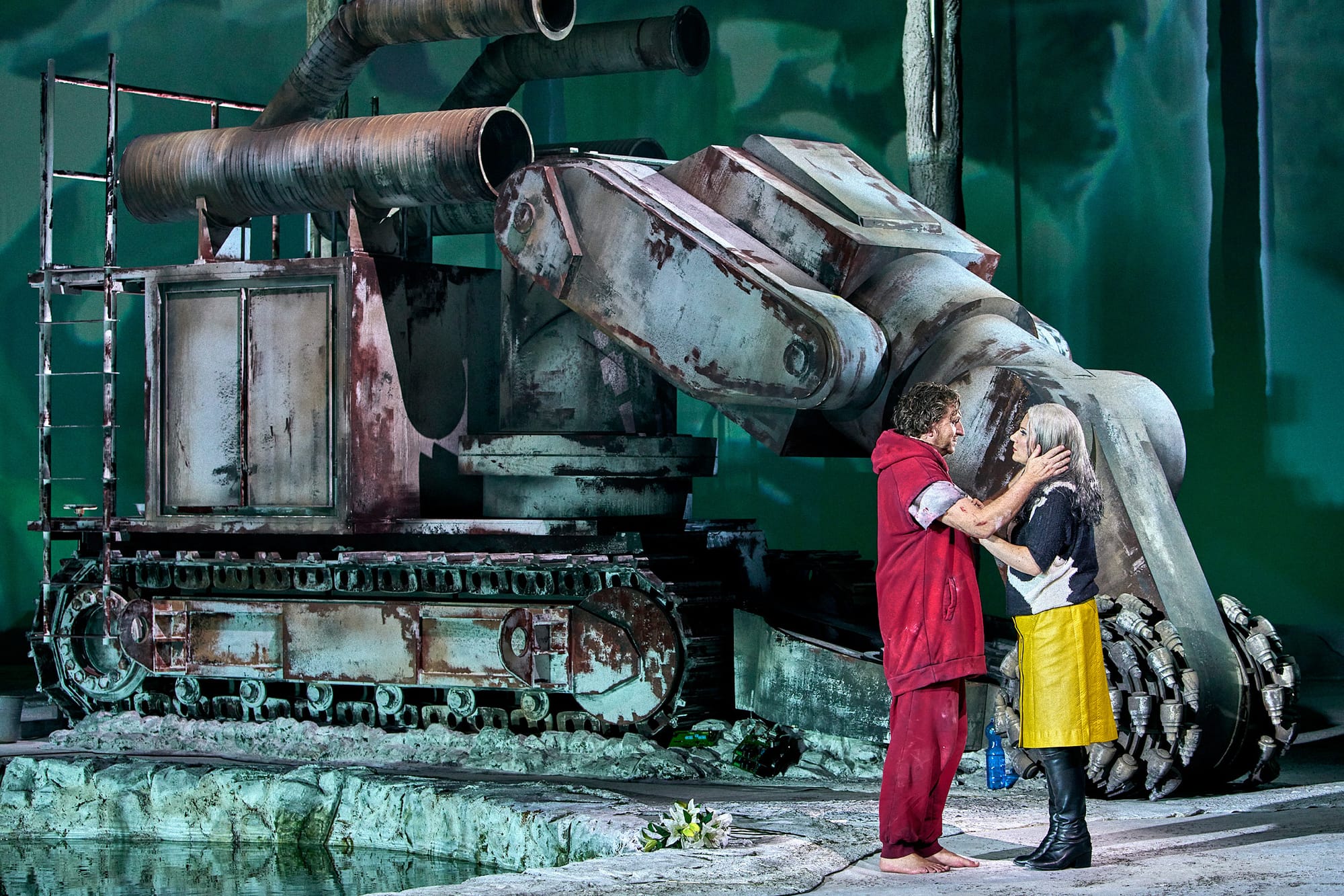 Das Wasserloch auf der Bühne funktioniert im ersten Aufzug noch. Das Wasser ist sauber. Im dritten Aufzug symbolisiert das Loch eine Katastrophe, in die man hineinschaut. Eine Wunde der Natur, geschlagen von uns Menschen, wir haben Schuld an der industriellen Ausbeutung der Erde. Die Wunde in Parsifals Herz hat den Namen seiner Mutter, Herzeleide, sie frisst ihn von innen heraus auf.