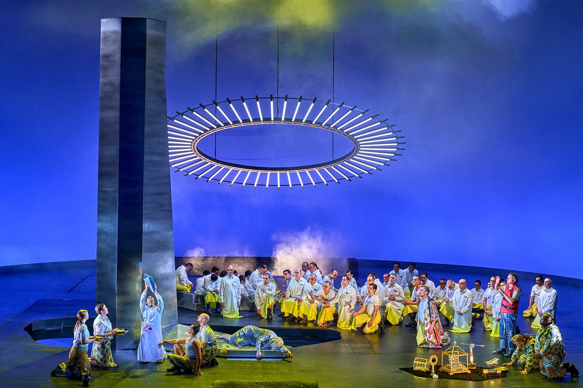 All diese Symbole tauchen auch in der AR als Verstärkung wieder auf. Die Gralsglocken erklingen und verbreiten eben jene Atmosphäre, der man sich nicht entziehen kann und die den Parsifal so besonders macht. Der Chor der Gralsritter „Zum letzten Liebesmahle“ zeichnet sich durch absolute Ausgewogenheit und exzellente Textverständlichkeit aus (Chorleitung Eberhard Friedrich). Der Herrenchor steigert sich zu einem bombastischen Fortissimo, unterstrichen vom tiefen Blech des Orchesters in einer ungeheuren Dynamik. Aus der Höhe („auf dem Theater“) ertönt der Frauenchor mit dem Glaubensmotiv, „Der Glaube lebt, die Taube schwebt, des Heilands holder Bote“. Gerade im Parsifal ist es immer wieder der phantastische Festspielchor, der für die ganz besonderen Momente sorgt. Die Ritter bringen Amfortas, in seinem langen weißen Mantel ein großer runder Ausschnitt für die Sichtbarmachung der blutenden Wunde. Gurnemanz erscheint in einem prachtvollen geschmückten Mantel. Die Knappen bringen die Abendmahlsgefäße und den mit einem Tuch verhüllten Gral, der in diesem Fall ein riesiger Kobalt-Kristall ist, Sinnbild für die Bodenschätze und seltenen Erden, die für uns heutige Menschen so wertvoll geworden sind. Aus dem Hintergrund erklingt die Stimme Titurels (Tobias Kehrer), „Mein Sohn Amfortas, bist du am Amt?“ Als alle versammelt sind, fordert Titurel Amfortas auf „Enthüllet den Gral!“, doch dieser fürchtet sich, weil sein Leiden dadurch immer wieder verlängert wird, „Nein, lasst ihn unenthüllt!“ Den folgenden großen Monolog gestaltet Derek Welton sehr eindrucksvoll und expressiv. Er stell den Gequälten absolut überzeugend dar. Die Farbe im Hintergrund wechselt von hellblau über gelb zu grün. Die Ritter bringen den uralten Titurel, er geht barfuß, hat lange graue Haare und einen Bart und trägt ein langes graues Gewand. Die Szene steigert sich immer mehr, in den Soli, im Orchester wie durch die Bühne. Gurnemanz fordert nun wiederholt „Enthüllet den Gral“. Amfortas kniet, kann sich kaum noch halten. Der Gral, ein blauer Kristall, wird der Gemeinschaft der Ritter präsentiert. Zu der Abendmahlszeremonie lässt Amfortas Blut aus einer Schale über den Gral in eine andere Schale fließen. Er trinkt von dem Blut, ebenso Titurel. Dieser erscheint daraufhin plötzlich deutlich verjüngt, mit kurzen Haaren und ohne Bart. Tobias Kehrer begeistert durch sein wunderschönes Timbre, sonore Tiefe und gute Textverständlichkeit. Zur Chorstelle „Wein und Brot des letzten Mahles wandelt‘ einst der Herr des Grales“ machen die Flöten auf sich aufmerksam. Das Orchester ist dezent abgestimmt, die Balance zwischen Bühne und Graben passt. Zu den Worten „Nehmet vom Brot…“ tragen die Ritter die Reliquien raus. „Froh im Verein“ erklingt in satten Fortissimo. Zum letzten „Selig im Glauben“ heben alle die Arme in die Höhe. Gurnemanz, Kundry und Parsifal bleiben zurück. Parsifal steht wie erstarrt vor dem Monolithen. Im Orchester erklingen wieder die Gralsglocken, der Lichterkranz senkt sich zurück in den See, das Licht wird gedimmt. Gurnemanz fragt Parsifal „Weißt du, was du sahst?“ und jagt ihn fort, da er offenbar keine Ahnung hat. Parsifal geht ab und es erklingt die Stimme aus der Höhe „Durch Mitleid wissend, der reine Tor!“ (sehr schön rein und strahlend Marie Henriette Reinhold). Hinter Kundry leuchtet rosa strahlendes Licht. Der Frauenchor beendet mit zartesten ppp mit dem Ausruf „Selig im Glauben!“ den ersten Aufzug.