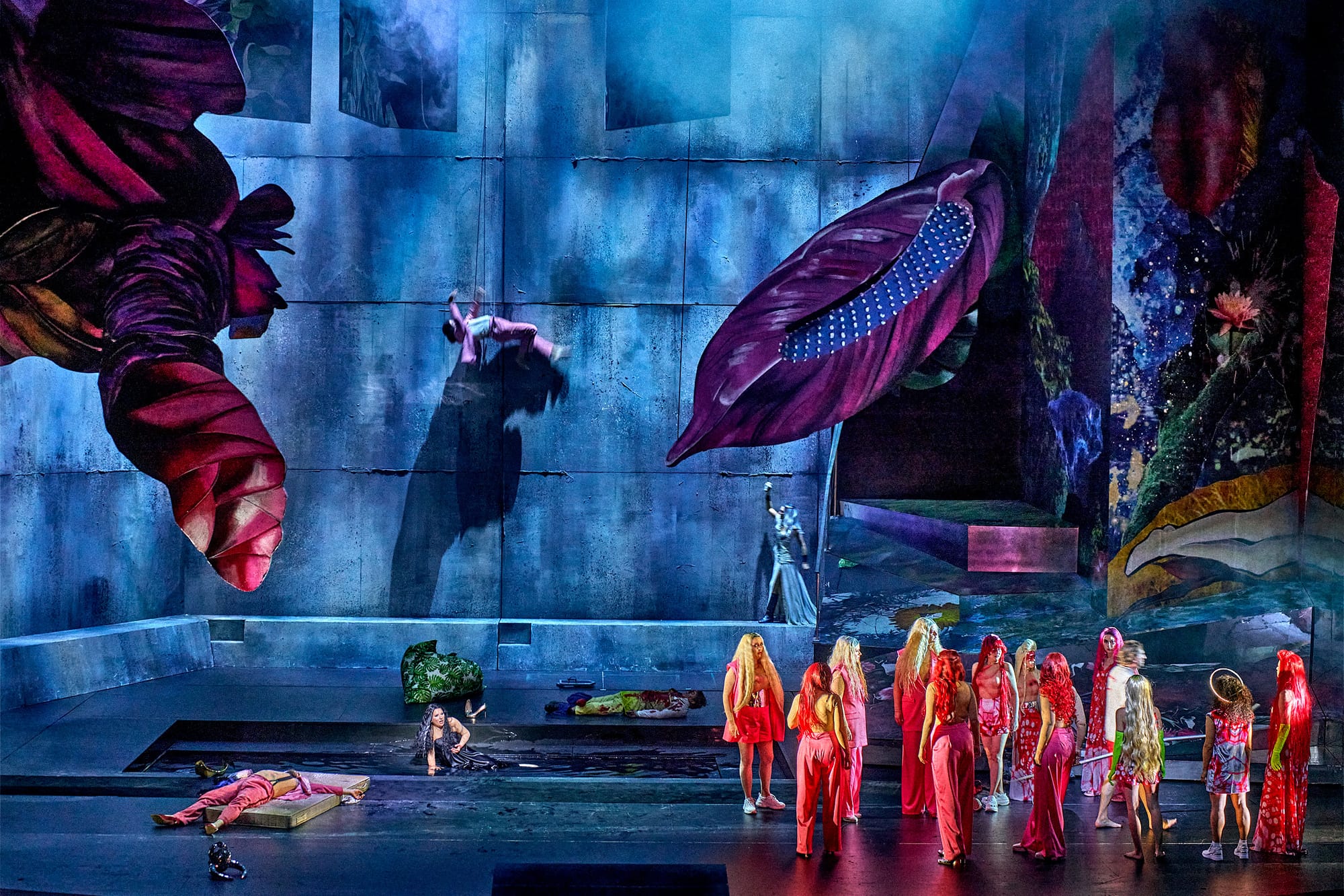 Kundry liegt im Hintergrund auf einer Mauer. Mit den Worten „Herauf, herauf zu mir, dein Meister ruft dich Namenlose!“ ruft er Kundry herbei. Im Hintergrund „erwacht“ Kundry und lässt die berüchtigten Kundryrufe erklingen, während im Vordergrund das Kundry-Double zu sehen ist. In der Mitte befindet sich das Wasserbecken, in das einige Stufen hinabführen. Für einen kleinen Lacher im Publikum sorgt die Tatsache, dass Parsifal in Klingsors Zauberreich eindringt, indem er sich von der hinteren Wand abseilt. Das Orchester agiert voller Schwung, lebendig und leicht, dann wieder zupackend. Die Blumenmädchenszene besticht durch geballte Erotik gepaart mit ausgezeichnetem Gesang. Die Szene ist gut zwanzig Minuten lang und äußerst komplex komponiert. Sechs Blumenmädchen-Solistinnen konzertieren mit sechs Chorstimmen in zwei Chören. Die Solo-Blumenmädchen (Evelin Novak, Catalina Bertucci, Margaret Plummer, Flurina Stucki, Betsy Horne, Marie Henriette Reinhold) geben sich alle Mühe, den unschuldigen Parsifal nach allen Regeln der Kunst zu verführen. Dies geschieht auf höchstem musikalischen Niveau, die sechs Damen sind perfekt zusammen, präzise und gestalten die anspruchsvolle Szene mit großer Souveränität und Leichtigkeit, dass es eine Freude ist, zuzuschauen und –zuhören. Die Blumenmädchen tragen pinkfarbene Hosenanzüge und ähnlich wie Klingsor Blumentattoos auf dem Oberkörper. Die ganze Bühne ist geprägt von prächtigen knalligen Farben und großen Blüten und Blättern, ein üppiger fruchtbarer Garten. Mitten in dieser Pracht findet sich der naive Parsifal wieder. Plötzlich umgarnen die Mädchen ihn nicht nur, nein, sie spielen auch mit den Köpfen der Ritter Ball, die Klingsor in die Falle gegangen sind, ein etwas makabres Schauspiel. Wieder folgt die Live-Kamera dem Geschehen und überträgt die Details auf die große Projektionsfläche. Die Blumenmädchen ziehen Parsifal aus. Er trägt ein weißes Shirt und rote Shorts. Während sie noch an ihm zerren und sich um ihn streiten, ruft Kundry ihn bei seinem Namen. Kundry trägt nun ein elegantes, dunkelblaues langes Kleid und einen goldenen Brustharnisch. Die Blumenmädchen verschwinden auf ein Zeichen Klingsors und Parsifal glaubt, dass er alles nur geträumt hat.