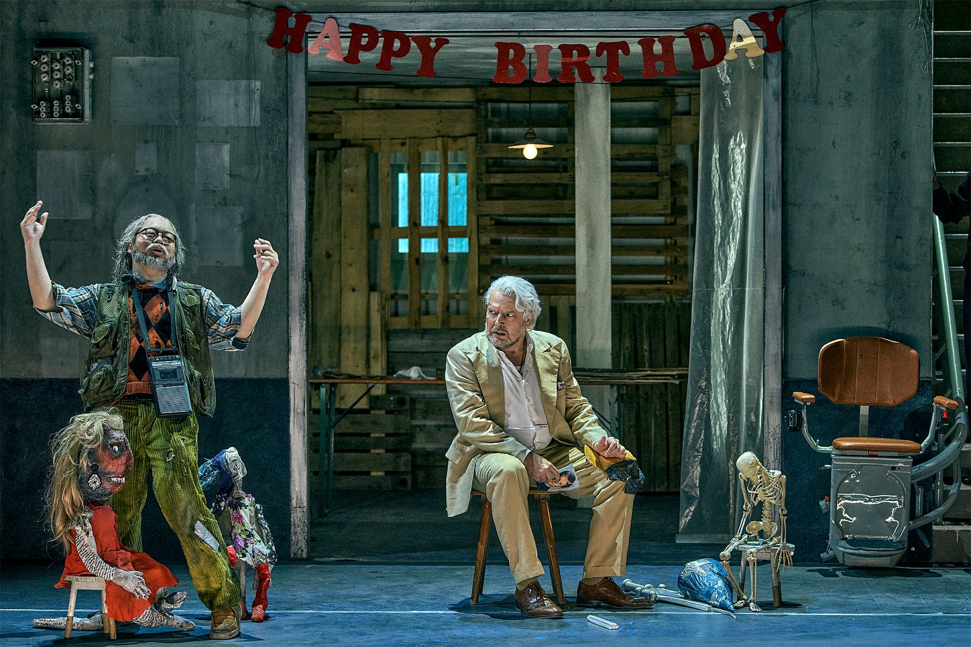 Valentin Schwarz (Regie) zeigt Siegfried als Produkt einer beschädigten Kindheit. Ein Kinderzimmer voller Puppen und ungeordnetem Sammelsurium ist die Werkstatt Mimes, eine Welt, in der aus Spiel Schmerz wird. Mime ist nicht der listige Nibelung, sondern ein tragisch-komisch-zerrissener Erzieher, der Kasperletheater spielt. Eine Puppe, die Sieglinde ähnelt, ein Aquarium, eine Girlande zum nie gefeierten Geburtstag: Das alles sind Fragmente, in dem Siegfried weder Herkunft noch Zukunft findet. Im 2. Aufzug verlagert sich das Geschehen in einen Salon, mehr ein Wartezimmer der Macht als mythischer Wald. Fafner ist kein Drache, sondern ein gebrechlicher alter Mann auf dem Sterbebett. Siegfried tötet ihn, indem er ihn mit dem Rollator umstößt und damit sein Leben auslöscht. Anstatt einer heroischen Kampfszene ist dieser Tod schockierend banal. Zeuge ist der stumme Hagen, eine wichtige Figur im Kontext der Regie, ein komplizenhafter Mittäter, in dem bereits die Saat seines Verrats in der Götterdämmerung keimt. Die Regie bleibt dabei mehr andeutend als erzählend. Sie deutet Mythos als Trauma. Wer hier Märchen erwartet, erhält eine Parabel auf Verlorenheit und männliche Selbstüberhöhung.