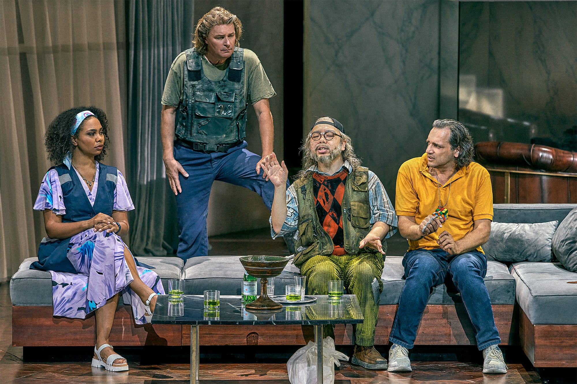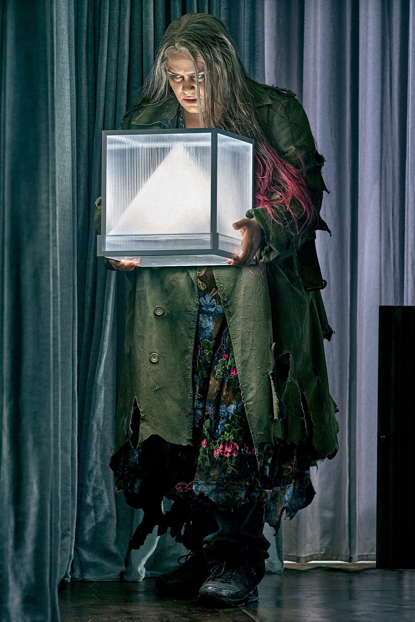 Die teilweise bewusst alltäglich gestaltete Bühne von Andrea Cozzi zeigt die „Höhle von Fafner“ grotesk, entmystifiziert als steriles Krankenzimmer. Der Regie entsprechend wird der Drache, völlig fremd wirkend, nicht als Ungeheuer, sondern als Pflegefall gezeigt. Die Bühnenausstattung erinnert an Reality-TV-Ästhetik. Sein Konzept ist ein sozialer Kommentar, modern, provokant und atmosphärisch dicht. Auch die Kostüme von Andy Besuch zeigen einen auffälligen Bruch mit mythologischem Pathos. Sie sind modern, realitätsnah und integraler Teil der zeitkritischen Inszenierung: Statement, nicht kosmetisches Beiwerk.