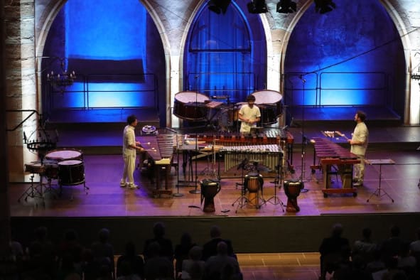 Ein umwerfendes Konzert erwartete uns mit den Percussions de Strasbourg aufgrund der Vielfalt des präsentierten Repertoires und der Subtilität der drei auftretenden Schlagzeuger. Wie bei jedem Konzert dieser Art richtet sich das Interesse des Publikums, noch bevor nur ein Ton erklingt, zunächst das auf der Bühne arrangierte Instrumentarium. Wie so oft im Perkussions-Repertoire erzeugen die Begriffe Resonanz, Nachhall und natürlich vor allem der Rhythmus die Komposition, die in einem ganz spezifischen Klanguniversum verankert ist und nicht durch die Tonhöhe des Klangs bestimmt wird: Sondern besonders durch Spielmodifikationen, Materialien, matte oder glänzende Klänge und mehr.