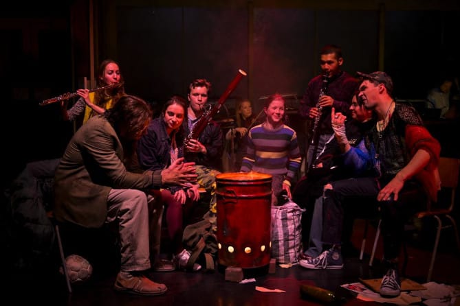 Aus einem Tor in der Rückwand der Spielfläche kommen eine Mutter mit Kind, eine Trauernde, ein Revolutionär sowie ein alter Mann mit den acht Musikern des Projektorchesters und nahmen uns in einem Pasticcio in ihre Situation. In deutscher, englischer, französischer und russischer Sprache vermittelten sie mit einer Kollage von Liedern und Opernausschnitten aus Werken der vergangenen zwei Jahrhunderte ihre Gefühlszustände ob der ungeklärten Sachlage. Die ausgezeichneten Sängerdarsteller standen für vier der unzähligen Glieder der Gesellschaft, die von ihren Erlebnissen und Erfahrungen in der Zeit der Gewalt berichteten und ihren unterschiedlichen Ängsten, Hoffnungen sowie Erwartungen Ausdruck gaben.