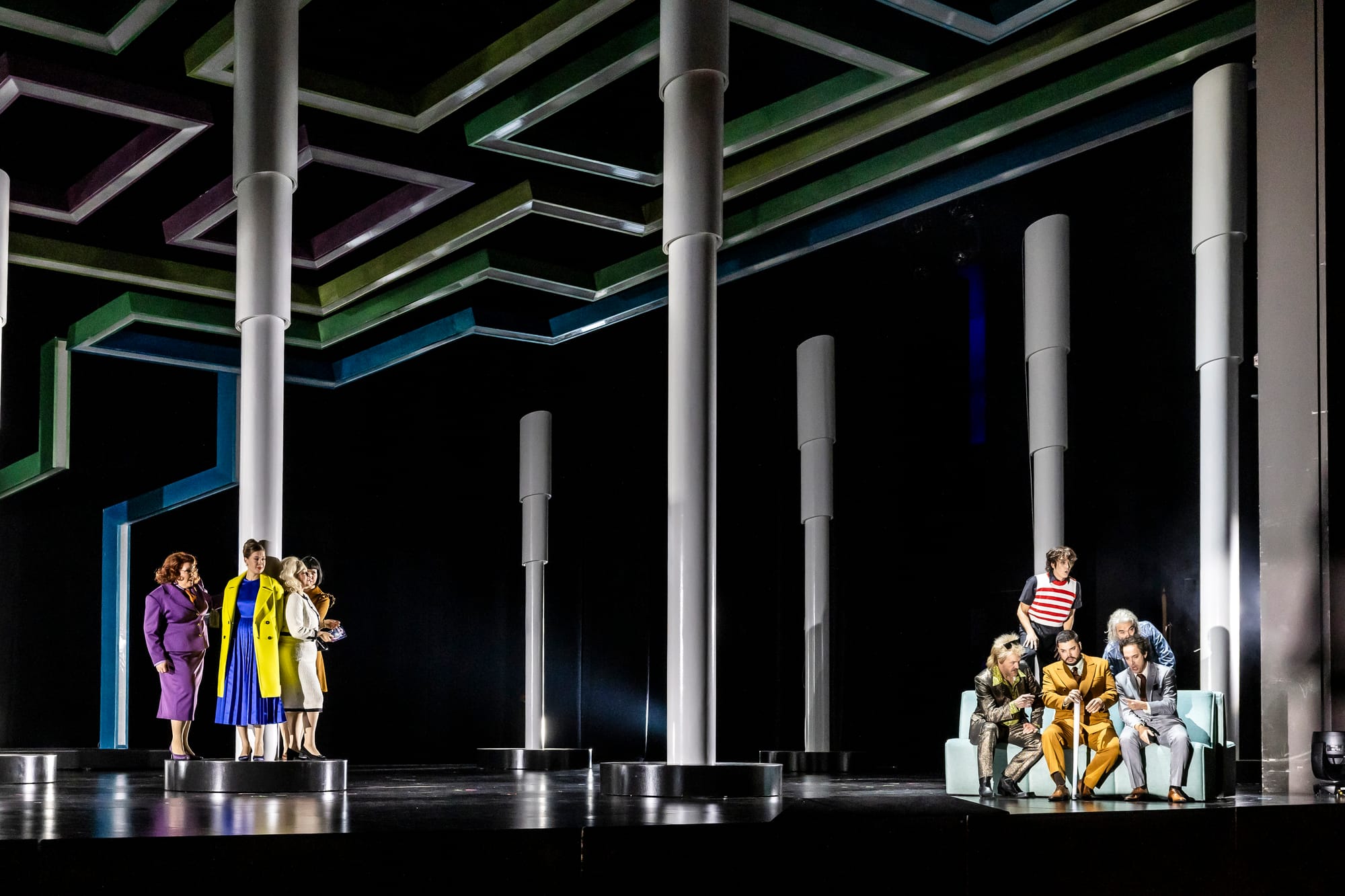 Für die Aktionen der ersten Akte hatte der Bühnenbildner Paolo Fantin auf der Spielfläche verfahrbare Säulen angeordnet, die beliebige Handlungsräume symbolisierten und die auch die Agierenden dort platzierten. Von Sängern verschobene Sitzgruppen sorgten, dass Örtlichkeiten unproblematisch verändert werden konnten. Mit diesen handwerklichen Glanzleistungen sicherte Fantin dank des umbaufreien Ablaufs das Tempo der Inszenierung. Interessanteweise wusste man als Zuschauer immer, wo etwas passierte. Mit den auf den Podesten befindlichen Solisten übernahm die Technik einen nicht geringen Teil der Personenführung. Die turbulenten Szenen bereiteten mit ihrem Treiben Spaß, zumal vom Beginn an klar war, dass der Übeltäter seine Strafe bekommen werde, wie auch immer. Sie erreichten ihren Kumulationsbereich, als das Ehebett der Fords in den Raum geschoben wurde und Frau Alice den ahnungslosen Falstaff massiv anmachte. Aus der Warnung der Verschwörerinnen und der anstürmenden Suchtruppe entwickelte sich eine Slapstick-Szene vom Feinsten. Das ohnehin verwüstete Bett wurde nach oben gezogen und überschüttete den fliehenden Falstaff mit leeren Getränkedosen.