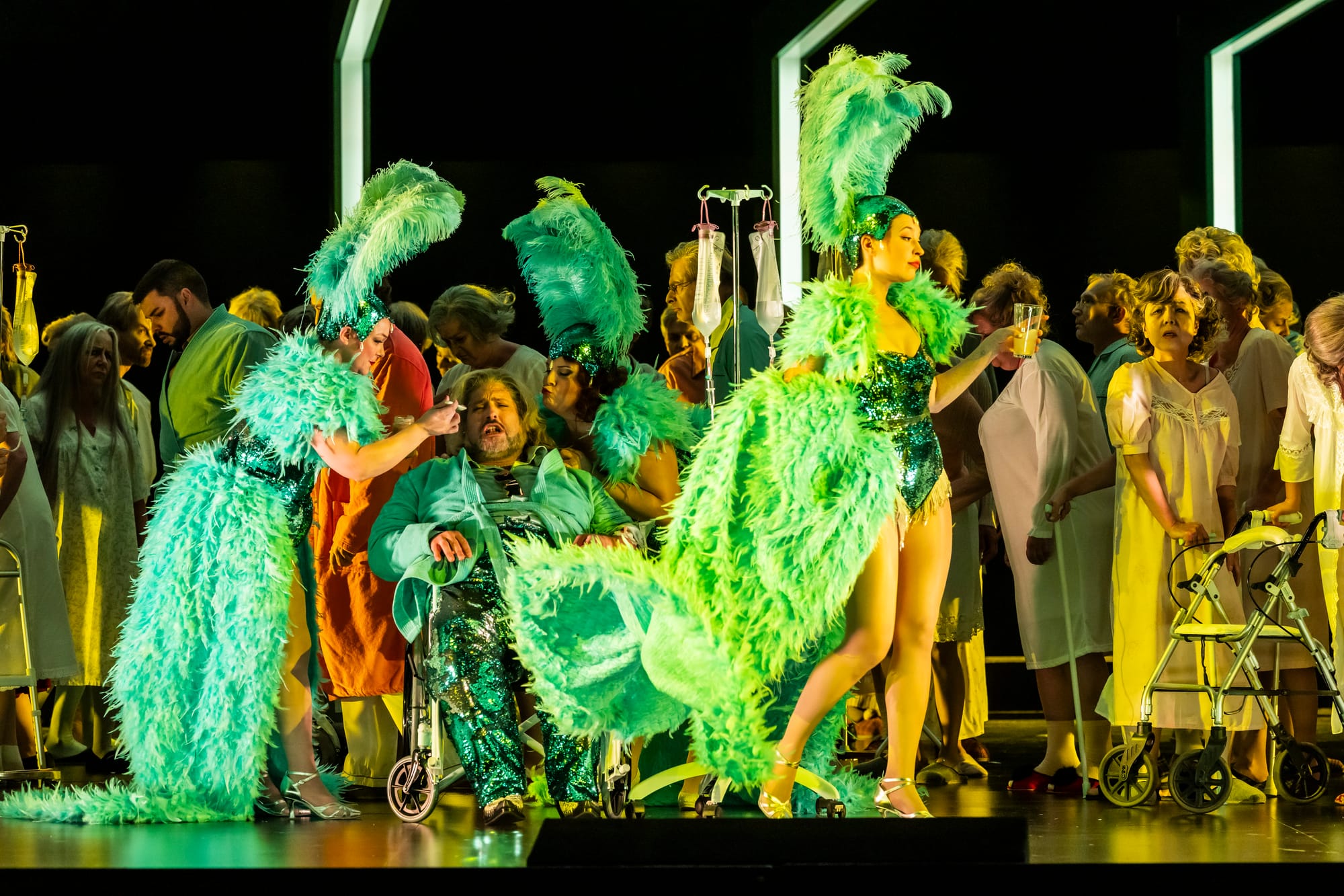 In der wenig humorvollen Finalszene wollte die Stadtgesellschaft den unbequemen Falstaff eigentlich in einem Pflegeheim entsorgen. Mitglieder der Komparserie und des von Jan Hoffmann einstudierten Sächsischen Staatsopernchor bedrängten deshalb den Erniedrigten mit Rollstühlen, Krücken, Gehhilfen und anderem Pflegeaccessoire. Aber der Anti-Held erhob sich aus dem Rollstuhl, schob das Gestänge mit den Infusionen zur Seite und setzte zu seiner berühmten Gardinenpredigt an. Plötzlich wurde alles gut und alle liebten sich. Das Plakat mit dem jungen Sir-John-Star wurde gerichtet, Autogrammkarten tauchten auf und das renovierte Podium der Band wurde eingefahren. Ein Neustart war möglich.
