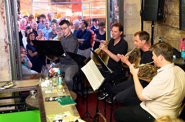 Im urigen „BOTTOMS UP“ - Lokal spielten die Blechbläser der Staatskapelle Matthias Schmutzler (Trompete), Erich Markwart (Horn) Adrian Wehle (Posaune) sowie Peter Erbe (Tuba) Werke von Mozart, Debussy und Henderson.