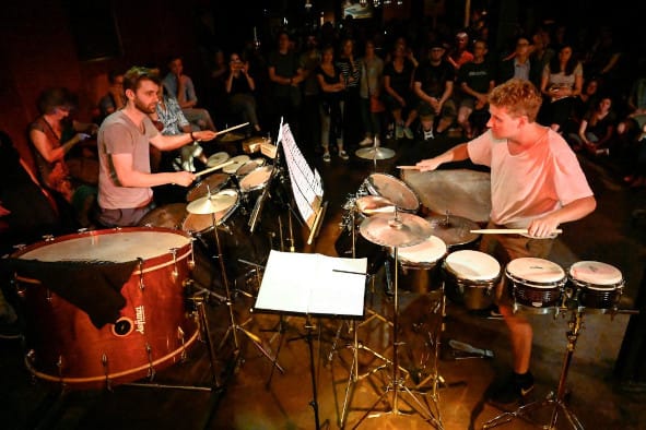 In der Club-Bar „GROOVE STATZON“ dröhnte das Schlagzeugquartett Manuel Westermann, Christian Langer, Simon Etzold und Huon Thomas mit dem „Frammenti“ des Schlagzeugtüftlers Domenico Melchiorre.