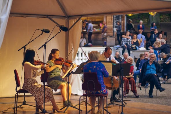 Das „Duo Bassello“ der Akademisten der Staatskapelle Sebastian Mirow, Ion Lopez und Leal Rossini begeisterten u.a. mit Tango-Musik in der Bar „WOHNZIMMER“ ihre Besucher. Antonin Dvoráks „Amerikanisches Streichquartett“ F-Dur op. 96 wurde von Paige Kearl, YunaToki, Marcello Enna und Teresa Beldi im CAFÈ ECKSTEIN geboten.