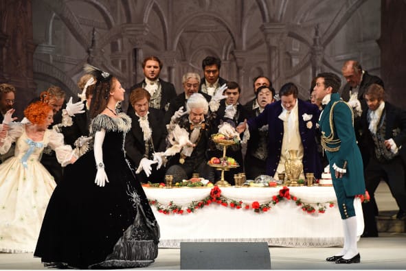 Der viel zu früh verstorbenen Regisseur Jean-Pierre Ponnelle (1932-1988) war ab Mitte der 60er Jahre eine der Größen der Opernregie. Viele seiner Opern-Inszenierungen gingen erfolgreich um die ganze Welt. Und so hat er uns auch ein Regiewerk hinterlassen, das bis heute noch nicht das Ende seiner Lebenszeit erreicht hat. Sondern sicher noch über die bisherigen 50 Jahre hinaus leben wird, wenn man die Begeisterungsstürme des Publikums zugrunde legt. Ponnelle zeigt uns kein Regietheater, kein Experiment, was man an (damals) aktuellen Themen aus dem Stück herauslesen könnte, keine leere Bühne, sondern er trifft mit seiner Inszenierung geradezu genial den Kern dessen, was Rossini geschrieben hat: Ein fast atemlos-überschäumend heiteres Werk voller Situationskomik, alles fühlt sich leicht, beflügelt, zeitlos an. Heute gibt es ein konsequentes Nein zu der düsteren Seite der Oper: Tief-abgründigen Sinnfragen bleiben aus, die großen schmerzhaft-tragischen Gefühle finden nicht statt. Sondern es wird konsequent nur heiter-ausgelassen gefeiert. Und wahrscheinlich hat sich diese Inszenierung genau deshalb 50 Jahre gehalten.