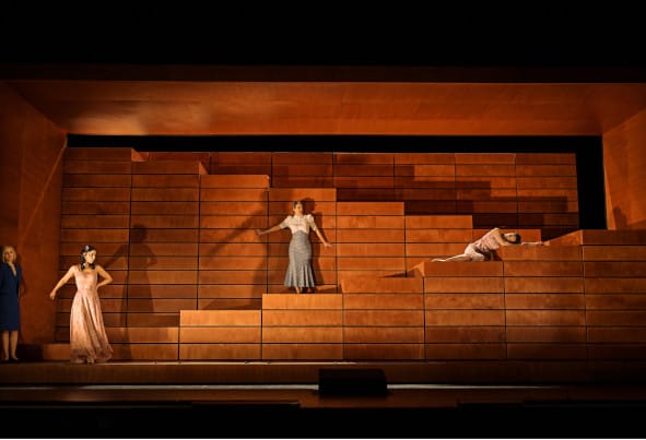 Wie nähert sich die Regie von Michael Thalheimer in Düsseldorf dieser Oper, besuchte Vorstellung 21.3.2024 ? Von der Tschaikowsky selbst sagt, dass sie handlungsarm ist, wenig bühnenwirksam. In seiner Inszenierung verzichtet er auf eine große Bebilderung, konzentriert sich, wie es Tschaikowsky ja auch gewollt hat, auf das Innenleben der Figuren. Dies geschieht hier, indem die Bühne (Henrik Ahr) zunächst mit einem großen Holzrahmen auf einen Guck-Kasten verkleinert wird. Und in diesem Kasten befindet sich eine flexible Wand aus 8 mal 16 Rechtecken, die eine rotbraune Färbung haben und eher an ein billiges Holzfurnier aus dem Baumarkt erinnern. Diese Rechtecke können so verschoben werden, dass darauf gespielt werden kann. Sie bilden manchmal eine begehbare Treppe, aber auch eine Mauer, von der Tatjana wie in einem Gefängnis eingeengt wird. Insgesamt kommt dieses reduzierte, meist statische Bühnenbild fast schon karg daher. So dass die Aufführung phasenweise schon fast konzertant wirkt.