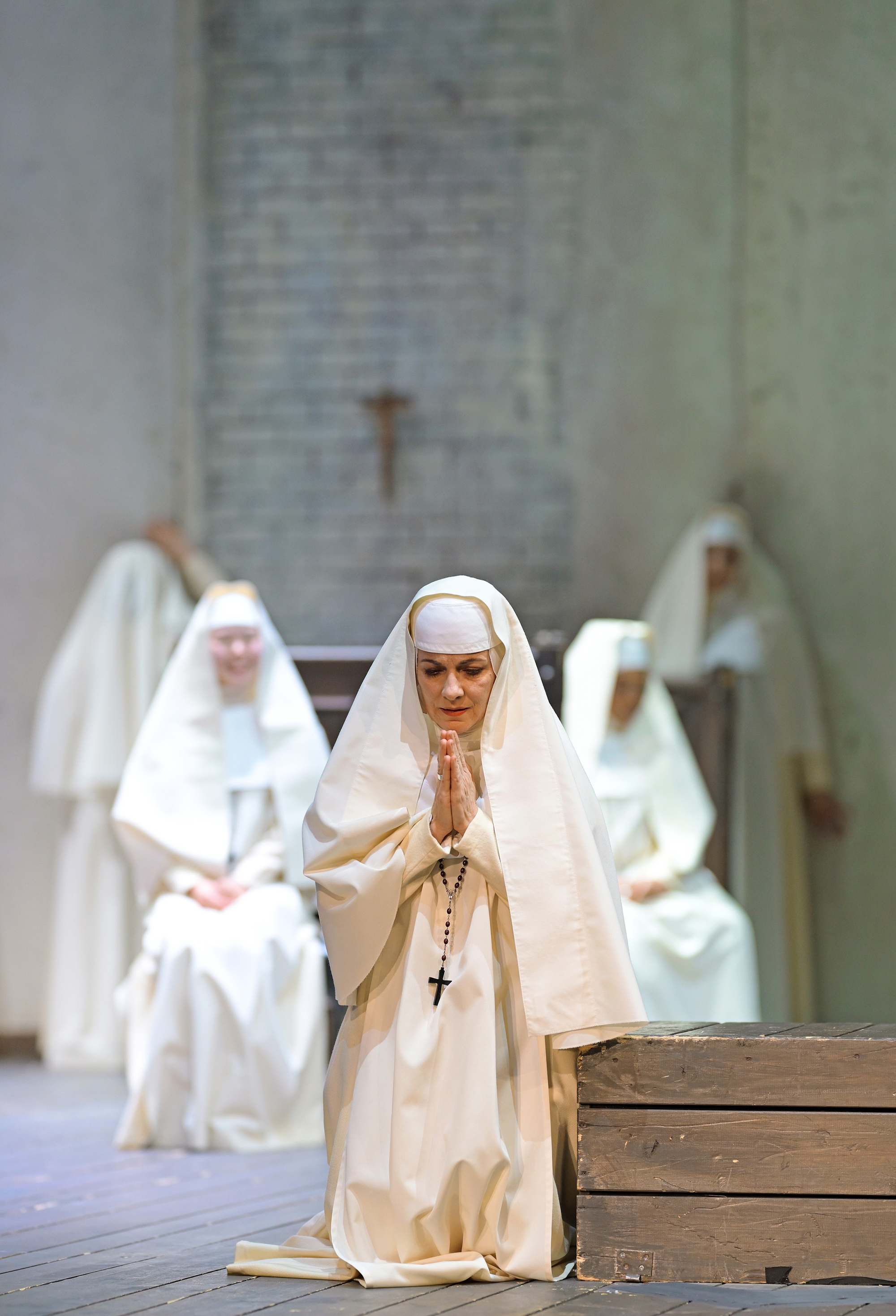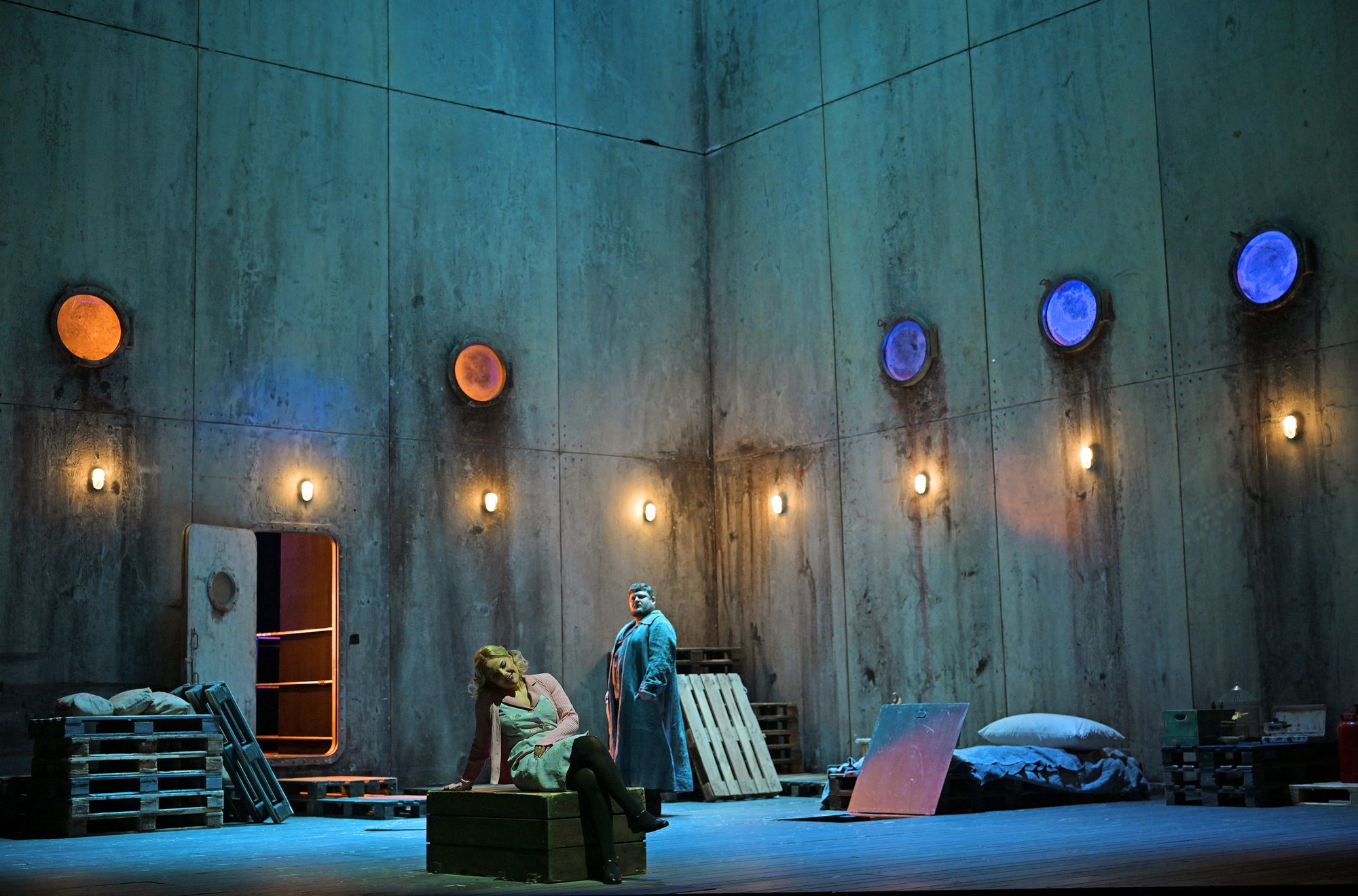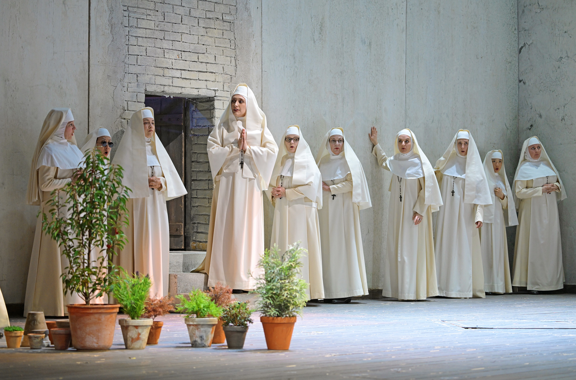 Das Triptychon spielt in allen drei Kurzopern in unterschiedlichen Zeiten, Orten und Situationen. Trotz aller Unterschiedlichkeit schafft es die Bühnengestaltung, die drei Opern zusammenzuhalten. Hohe, schmucklose Betonwände, eine Tür, ein Fenster, ein Bett - jeweils ein wenig der Szenerie angepasst, aber im Grundsatz gleich. Das bringt Ruhe in den großen Wechsel der Szenerie, ein gelungenes Bühnenbild. Und Dank der Kostüme wirkt die puristische Raumgestaltung dennoch stimmig und nicht etwa nur karg. Die Gewandmeisterin erfreut uns heute mit Kostümen, die tatsächlich zu Zeit und Ort des Geschehens passen - ohne verfremdeten oder gebrochenen Hintergrund. Das ist wirklich auch mal schön.