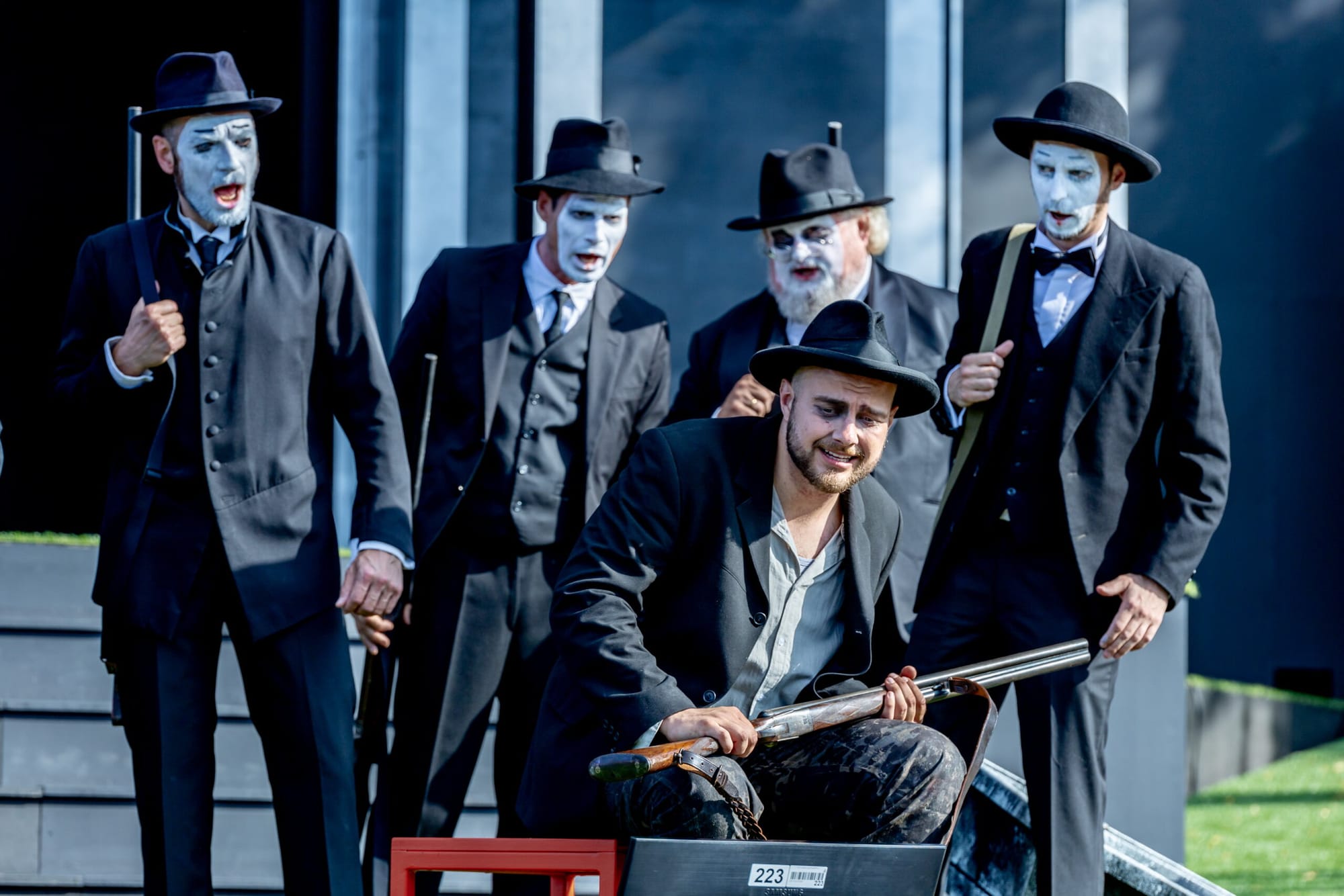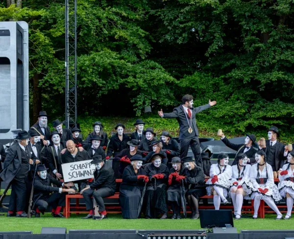 Dem erstklassigen Chor als schauerlich, angsterregende Geister in der Wolfsschluchtszene oder als engstirnige, kleinbürgerliche Masse mit einheitlich weißgeschminkten Gesichtern, Foto oben, kommt in der diesjährigen Inszenierung die Rolle zu, sowohl Kaspar als auch Max in die psychische Enge zu treiben. Max bleibt nur mehr der Bund mit dunklen Mächten, um mittels Freikugeln Treffsicherheit beim Probeschuss beweisen zu können. Die Enge der gesellschaftlichen Gegebenheiten macht aus ihm den Freischütz – eine Produktion der Eutiner Festspiele, die man jedenfalls erleben muss!