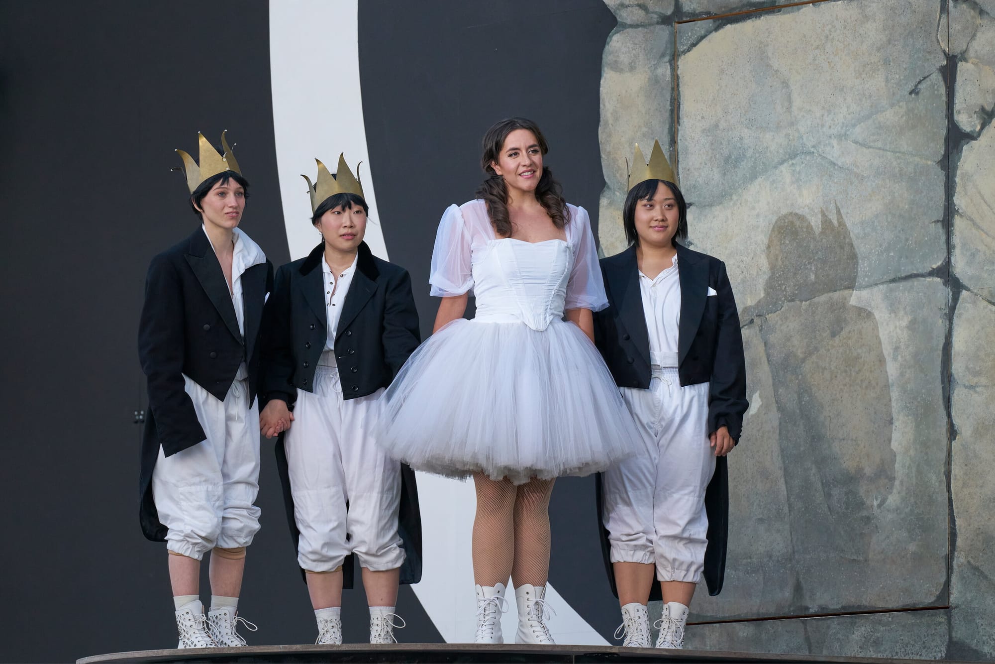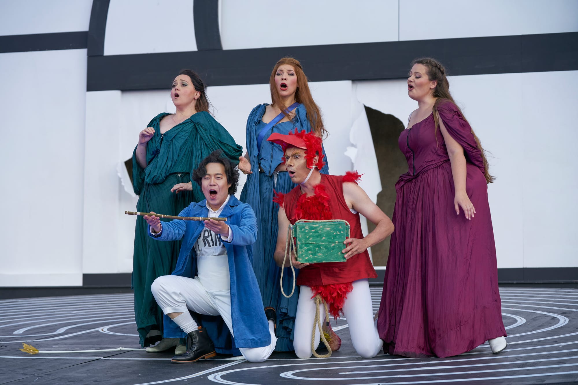 Das zweckmäßige, von Jörg Brombacher entworfene Bühnenbild bestand aus einer großen schwarz-weißen Scheibe mit kleineren Podesten links und rechts vor einer ebenfalls schwarz-weißen Rückwand mit drei Durchgängen, durch die die drei Damen ihre dramatischen Auftritte absolvierten, Walküren gleich mit langen Speeren, um Tamino vor der langen grünen Schlange zu retten und Papageno wegen seiner Prahlereien zu maßregeln (Ines Lex mit hellem Sopran als Erste Dame, Sarah Hudarew mit klangvollem Mezzo als Zweite Dame und Sandra Gerlach mit sattem Kontra-Alt als Dritte Dame).
