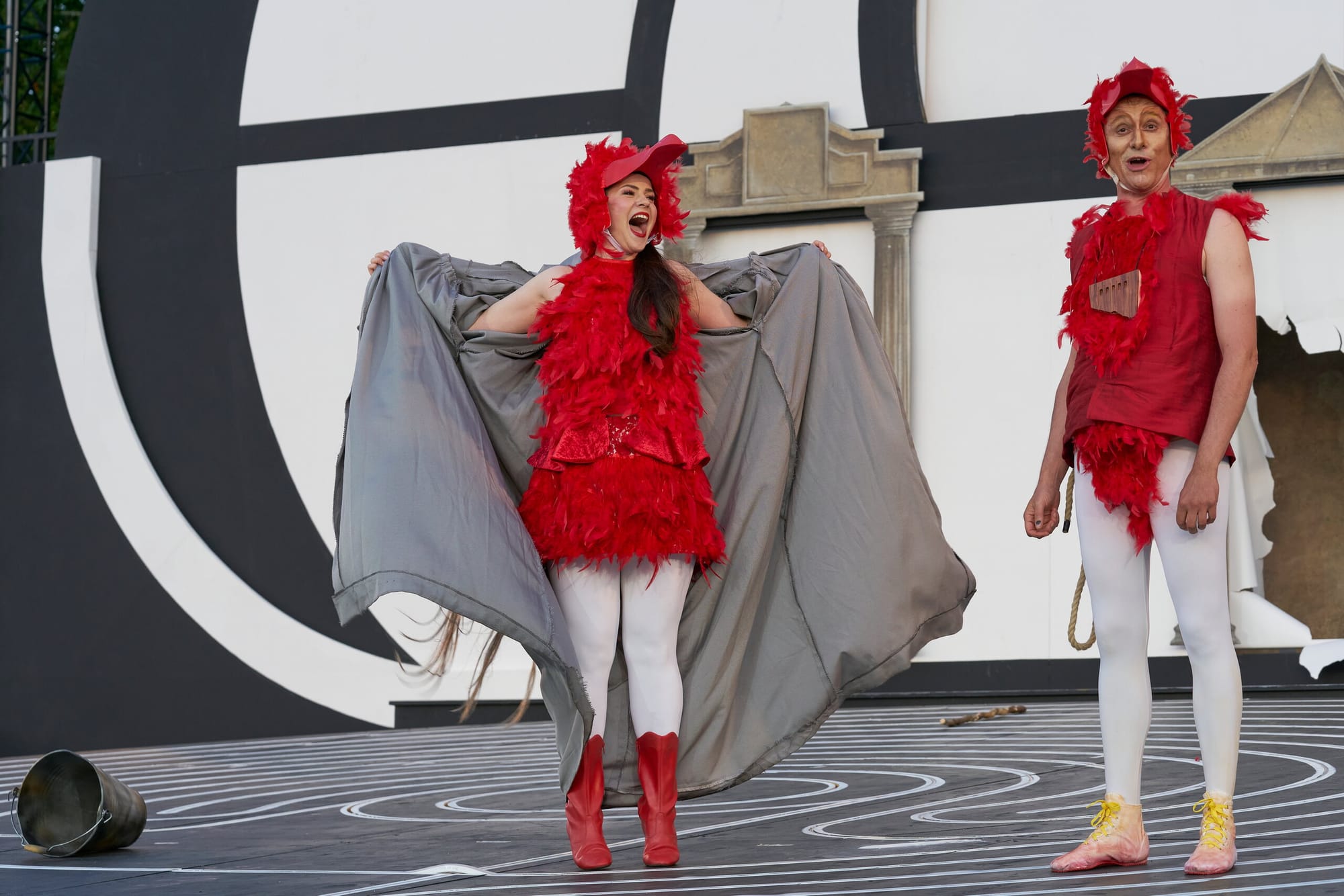 Wie in jeder Inszenierung der „Zauberflöte“ ist der stets fröhliche Papageno natürlich der absolute Sympathieträger, so auch hier. In seinem rot gefiederten Vogelkostüm sorgte Achim Hoffmann mit prägnantem Spielbariton überaus humorvoll mit seinen menschlichen Schwächen, dem genüsslichen Essen und Trinken, für die heitere Note, die ihren Höhepunkt schließlich in der Begegnung mit seiner zukünftigen Braut Papagena erreicht, entzückend dargestellt und wunderbar gesungen von der lyrischen Sopranistin Marie Maidowski aus dem Opernstudio der Hamburger Staatsoper, im passenden ähnlichen roten Vogelkleid (Kostümentwürfe von Gesa Gröning).