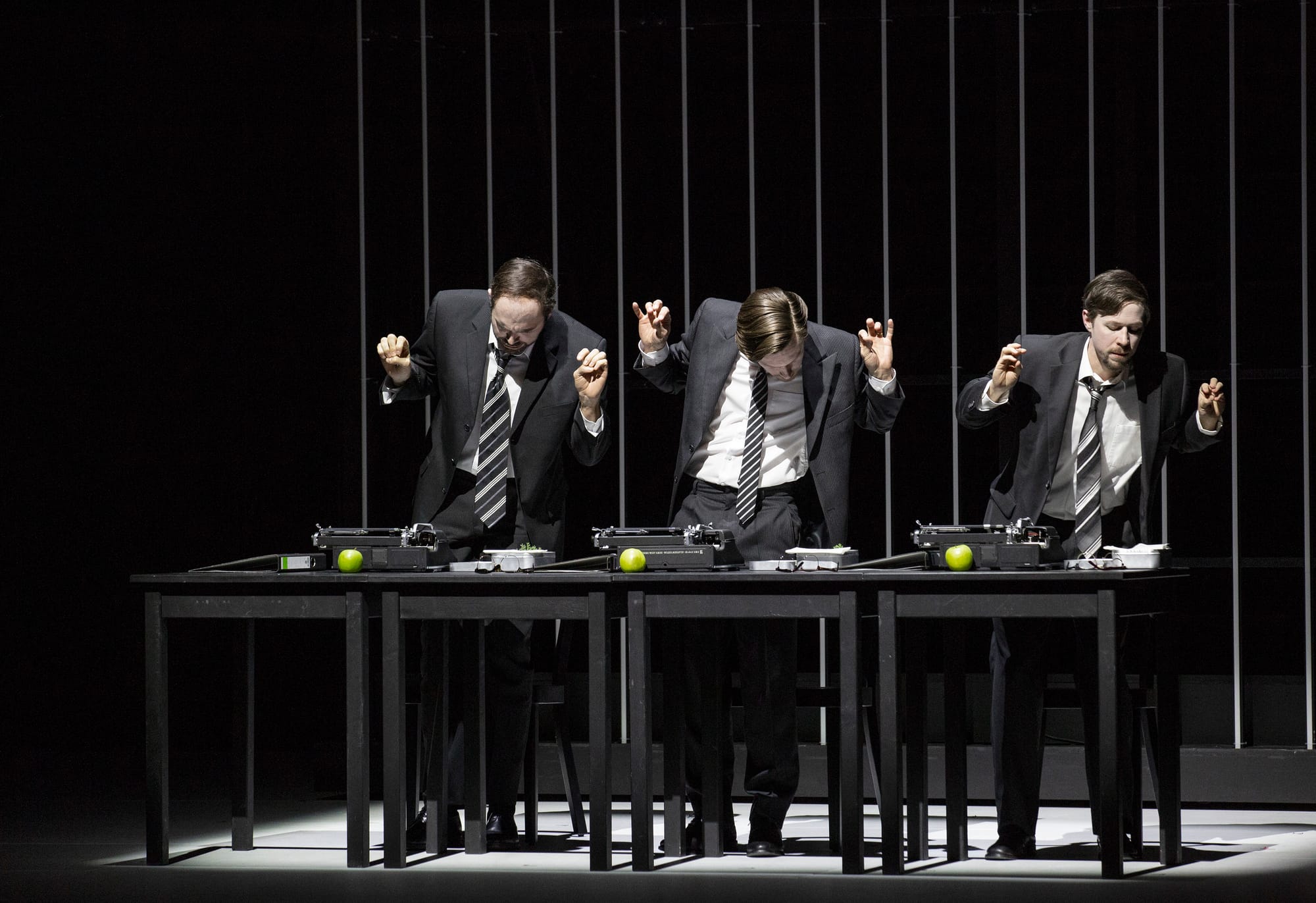 Das Bühnenbild von Johannes Leiacker streng in Schwarz und Weiß gehalten, das Gericht und Gefängnis links und rechts durch Käfige veranschaulicht und im Schlussakt nach hinten ausdehnend bis zu den Gitterstäben, die niemanden herauslassen, bietet den dafür äußeren Rahmen. Hier gibt es kein Entkommen, in dieser Welt zählt der Wille des Einzelnen nicht, nur Unterordnung. Deutlich veranschaulicht in der Szene mit den dienstbaren Bürokraten Ping, Pang und Pong; bei ihnen verengt sich das Bühnenbild auf das Nötigste. An einem Tisch mit drei Schreibmaschinen sitzend – komisch wird es nur andeutungsweise durch die ihnen in immer schnellerer Abfolge verabreichten Ordner – beklagen sie ihren verhängnisvollen Zustand: aus dieser „Nummer“ kommen sie nicht mehr heraus, ihre schönen heimatlichen Gärten oder Seen bleiben Sehnsuchtsorte. Und sie waschen im Gerichtssaal – wie schon Pontius Pilatus – ständig ihre Hände. Ihre Anzüge sind einheitlich dunkel, mit Hemd und etwas unterschiedlichen Krawatten, ohne individuelle Merkmale gehalten, setzen den durch das Bühnenbild vorgegebenen „Look“ fort; für die Kostüme sorgte Ursula Renzenbrink. Auch der Mandarin in einem ähnlichen Anzug unterscheidet sich nicht von den anderen, er ist ebenso ein Diener des Staates. Einzig Liù, Timur und Calaf heben sich mit ihrer helleren Kleidung hervor. Der Kaiser, ein kränklicher, alter Mann, trägt eine alte viel zu weite Anzugsjacke, was seinen kränklichen Zustand noch unterstreicht. Turandot dagegen wird von einem langen weißen Kleid umhüllt, ihr Gesicht – wie schon erwähnt – von einer weißen Maske bedeckt, die ihre Persönlichkeit unkenntlich macht oder ihre Grausamkeit unterstreichen soll. In gewisser Weise gleicht sie eher einem Phantom, besitzt keine Persönlichkeit, ihre hoch erhobenen Arme und ihre angespannte Körperhaltung lassen keine Gefühlsregungen erahnen. Nichts ist hier den Menschen zugetan, auch denen gegenüber nicht, die darüber bestimmen. Diese Atmosphäre wird auch durch die Lichtgestaltung von Alexander Koppelmann anschaulich erzeugt.