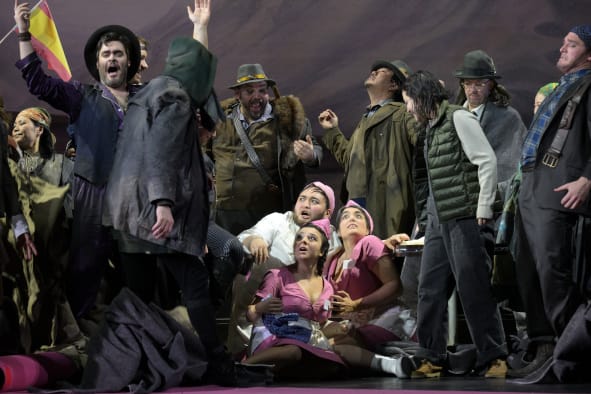Die sehr spanischen Spanier, hereingefahren auf einer Sitzbank, erzeugen die meisten Lacher im Publikum, da sie eine herrliche Parodie aller Spanien-Klischees so ungeniert vorführen und die Inszenierung an Fahrt aufnimmt. Schließlich singen sie von den einzig echten Spaniern und dem verachtenswerten Versuch, sich unverschämterweise als diese auszugeben – wie Recht sie haben, zeigt sich im dritten Akt. Nicht unerwähnt bleiben soll, dass im 19. Jahrhundert eine in Europa grassierende Spanien-Euphorie herrschte und die beiden Librettisten Meilhac und Halévy sich mit ihrer Bearbeitung von Prosper Mérimées Carmen-Novelle 1875 erneut in die Operngeschichte einschrieben. Bloß ist der Ausgang dieser Opéra-comique, wie Georges Biszets Oper im Untertitel heißt, alles andere als komisch.