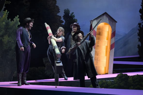 Diese Doppeldeutigkeit findet sich bereits im ersten Akt, wenn Falsacappa – der Bandenanführer – vier ahnungslose Mädchen in sein Versteck lotst, die von ihm wissen wollen, wohin der Pfad führt. Auf Französisch singt er betont ironisch-ausbuchstabierend von: v-i-r-t-u-e. Der Tugend eben, die bedroht ist – im ganz konkreten Fall von seinen durchaus unsittlich gesinnten Kumpanen, die er abwehren muss. Damit ist der Ton und die Handlung gesetzt und durchzieht das Stück: tugendhaftes Handeln ist ein hehres und ach so rares oder gar unerreichtes Gut. Diese Spitze nimmt Katharina Thoma ihrer kurzweiligen und auf Deutsch gesungenen Inszenierung allerdings, sie betont stattdessen den „Dornenpfad“ der sich harmlos und hübsch anzusehen zwischen den Bäumen entlangschlängelt; fröhlich werden die Mädchen auf einer rechts oberhalb des Orchestergraben installierten Rutsche in die Räuberhöhle geschubst. Ihr ist die Leichtigkeit der Inszenierung wichtig, nicht der doppelte Boden, der sich im Libretto gesteigert durch Offenbachs Musik versteckt. Wobei sie freilich zutreffend formuliert, „dass man hier und da aktualisieren muss, aber man muss nicht jedem Bezug hinterherlaufen.“