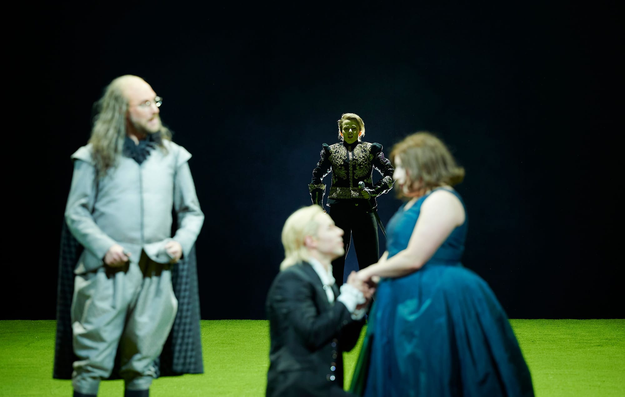 Das Bühnenbild von Anna-Sofia Kirsch zeigt zunächst eine große grüne Wiese vor schwarzem Hintergrund. Quadratische Öffnungen im Boden lassen jedoch bereits eine unterschwellige Unruhe entstehen. Nach der Pause versinkt die Bühne in Dunkelheit. Flammen schlagen aus den Öffnungen, während das Lichtdesign von Jan Hartmann eine geheimnisvolle Atmosphäre erzeugt.
