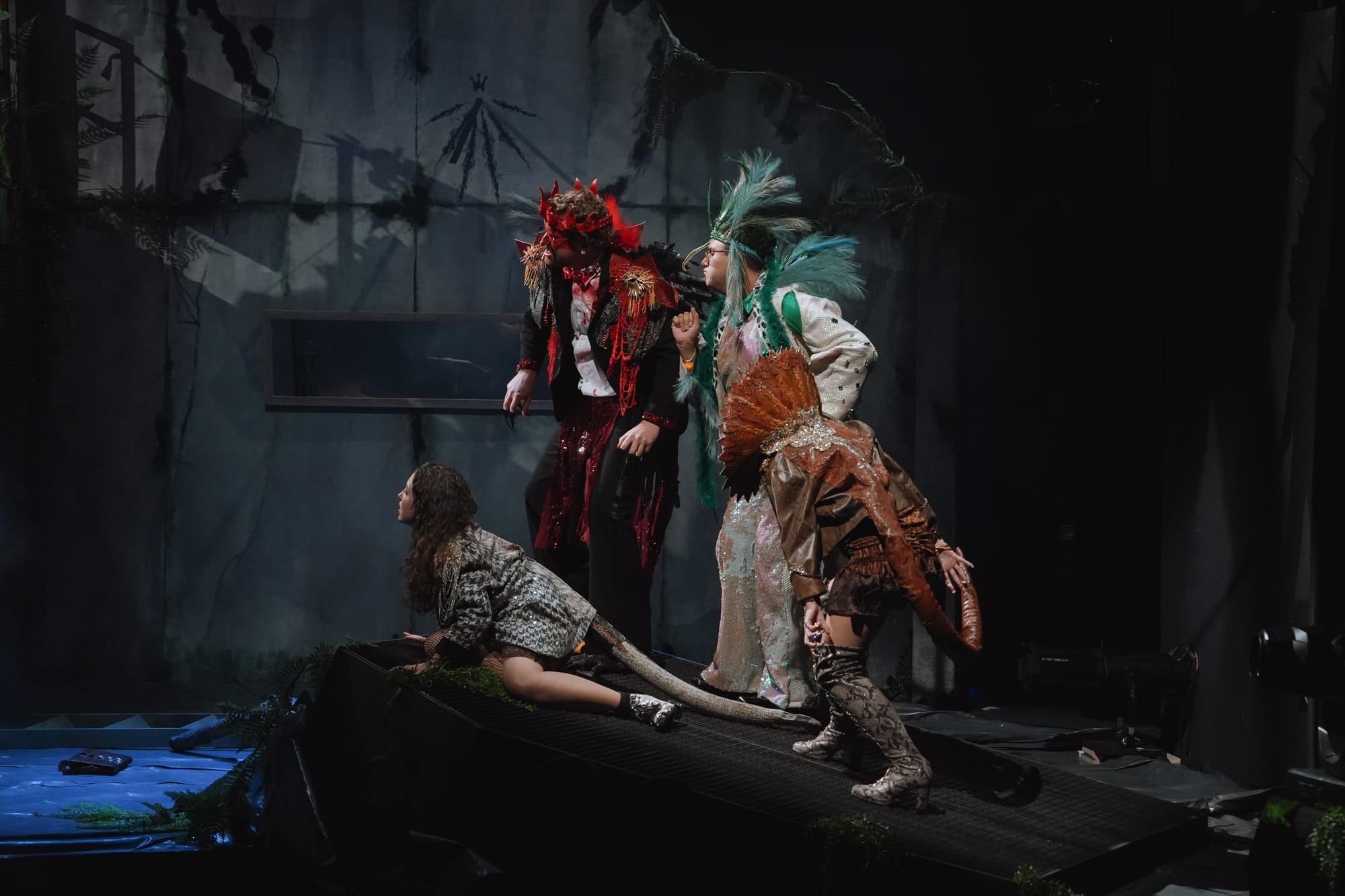 Und dann sind da noch die Dinosaurier! Stilvoll! Sehr stilvoll! Hight Heels, Glitzer, lange Nägel, selbstbewusste Blicke: Sie sind eindeutig modisch und völlig unbefangen. Eine Galerie farbenfroher Charaktere, zum Leben erweckt von einem engagierten und mitreißenden jungen Sängerensemble.