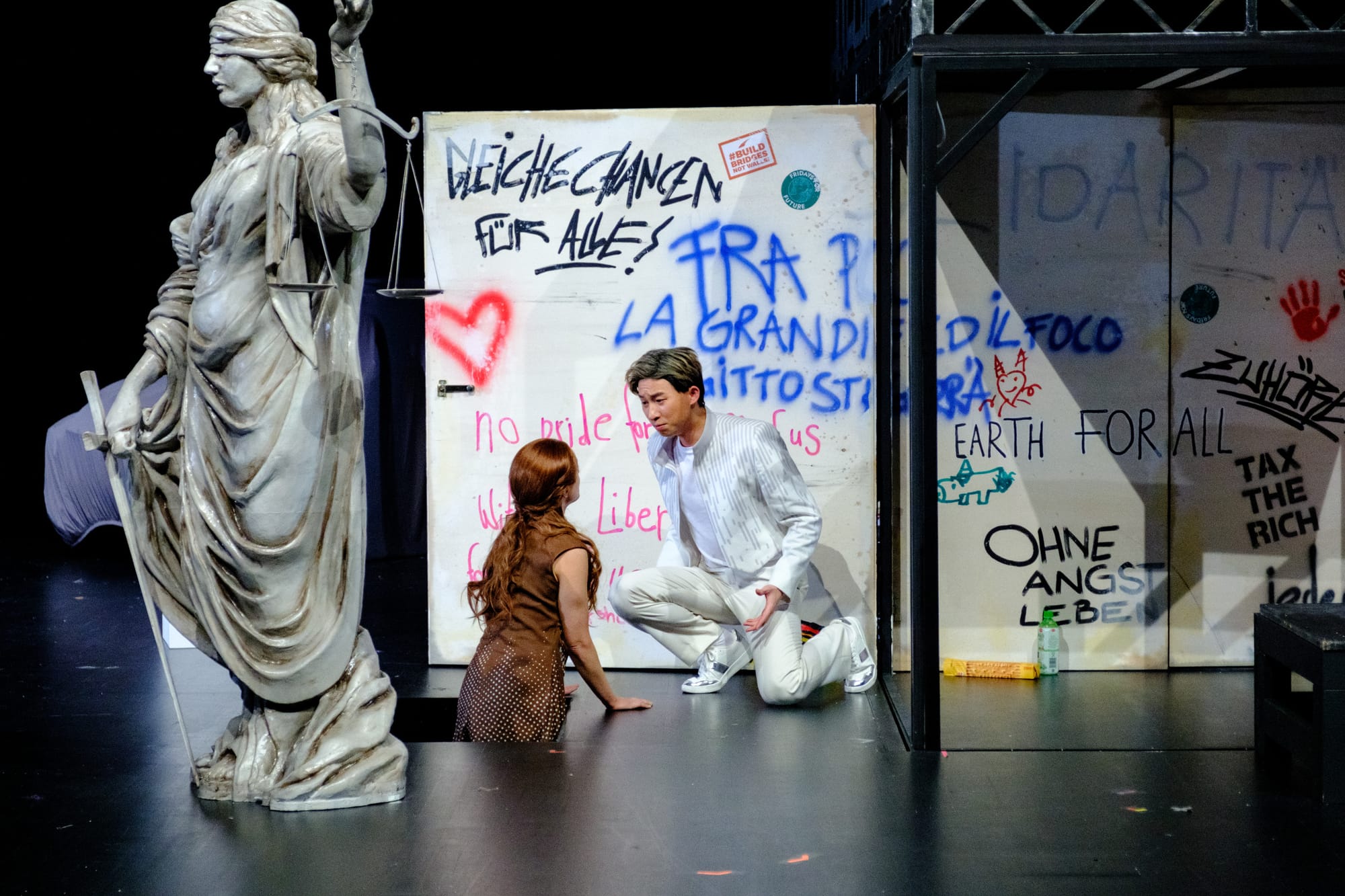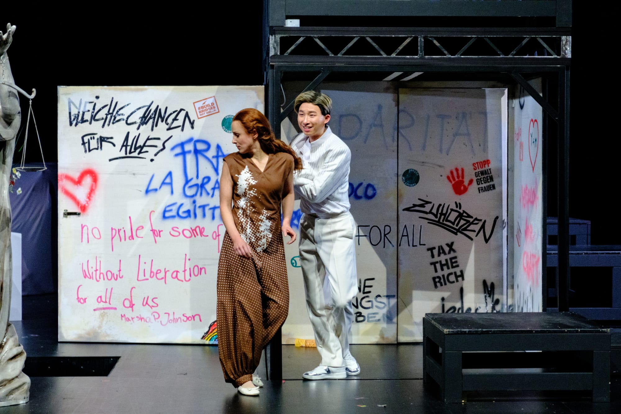 Doch leider blieb diese Vision auf der Bühne oft undeutlich. Manche Details des Bühnenbildes von Susanne Brendel, wie z. B. ein Oldtimer und ein Koffer wirkten in ihrer Ausführung fragmentarisch und ließen das Publikum im Ungewissen, was damit genau vermittelt werden sollte. Der Fokus der Inszenierung ist auch gespalten, entweder liegt er mehr auf der politischen Dimension der Geschichte, dem spirituellen Kampf Moses’ oder der tragischen Liebesgeschichte zwischen Osiride und Elcia. Die intellektuell reizvolle Idee des Konzeptes lässt beim Zuschauer ein paar Fragen offen, bewegt uns jedoch am Schuss und hinterlässt Nachdenklichkeit über Gemeinschaftsgefühl und zwischenmenschliche Beziehungen.