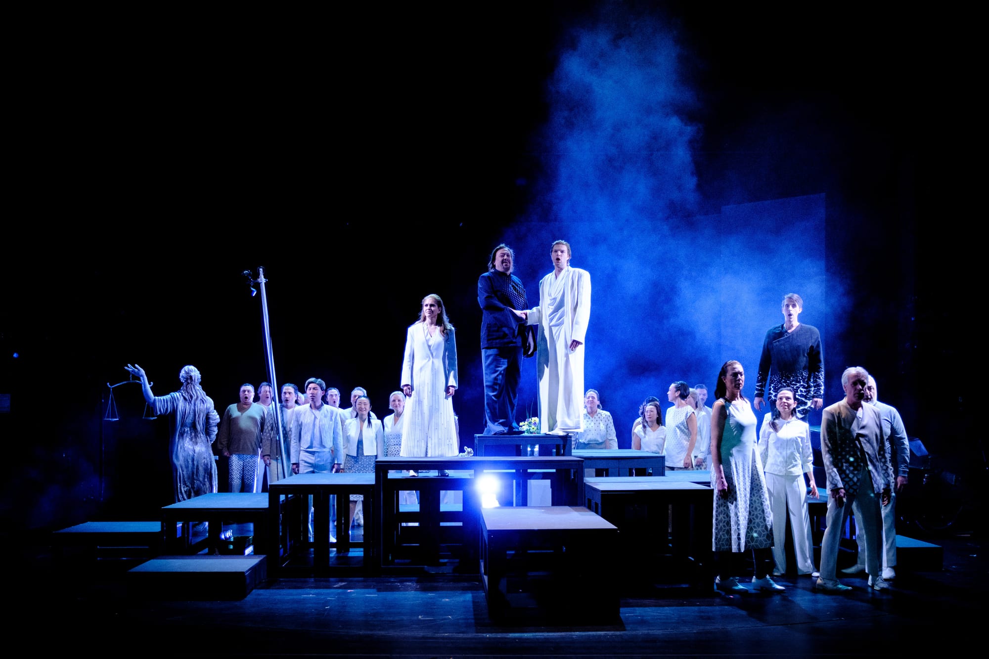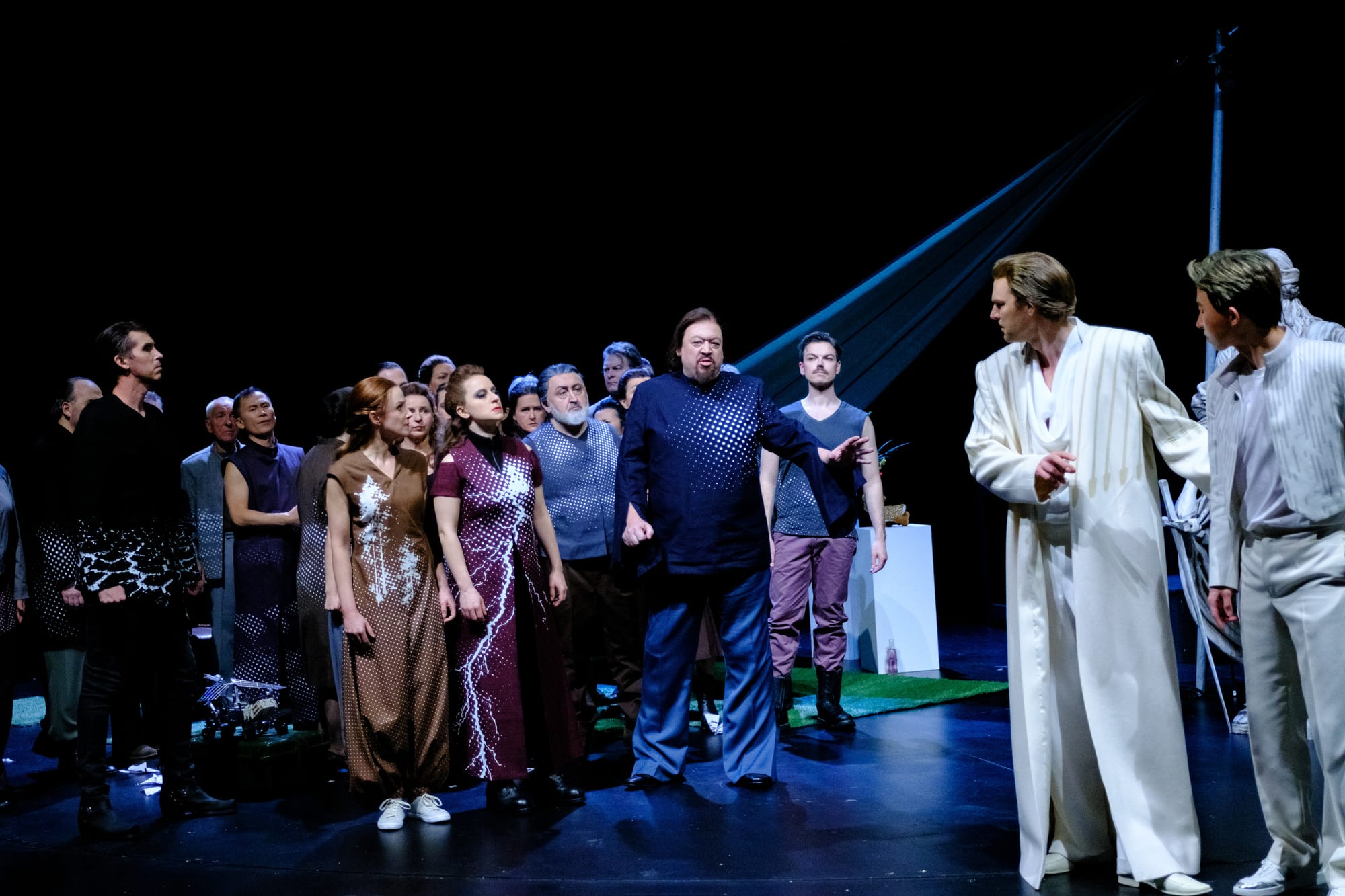 Stefan Stoll als Moses zeigte eine überzeugende stimmliche Präsenz, sang kraftvoll und autoritär. Als Osiride hörten wir Eric Jongyoung Kim, dessen seine Stimme strahlend war, dem es jedoch an klanglicher Freiheit mangelte; die Höhen wirkten grenzwertig angespannt und dadurch etwas schrill. Technische Souveränität beherrscht Annika Gerhards in der Rolle der Elcia. Ihre ausdrucksvolle Interpretation ließ die Zerrissenheit ihrer Figur zwischen Liebe und Loyalität deutlich spürbar werden. Der Pharao, gesungen von Clarke Ruth bestach durch eine starke Bühnenpräsenz, während die Amaltea von Julia Araújo mit ihrer stimmlichen Wärme für einen klangvollen Kontrast sorgte. Auch die Nebenrollen fügten sich harmonisch in das Gesamtbild ein. Randall Bills als Aron, Dakai Wei als Mambre und Jana Marković als Amenofi waren glaubhaft und spielten ihre jeweiligen Charaktere mit Präzision und Sorgfalt.