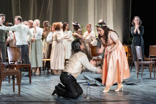 Wenn ich die Dramaturgie des Stückes in moderner Sprache beschreibe, sehen wir als Publikum deutlich zwei verschiedene Arten von Menschen: Auf der einen Seite gibt es diejenigen, die unbeschwert von Tag zu Tag leben, ohne sich allzu viele Gedanken zu machen oder zu philosophieren. Sie lachen, tanzen und genießen das Leben, geleitet von Poesie und Verliebtheit. Sie scheinen etwas entfernt von der Realität zu sein, und leider endet ihre Geschichte in einer Tragödie, in der Lenski sterben muss.