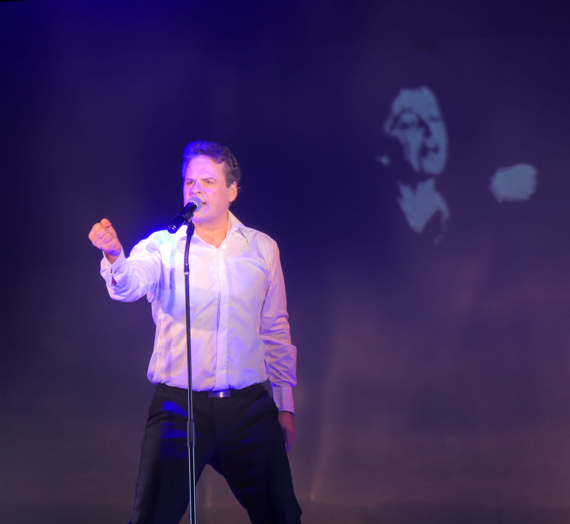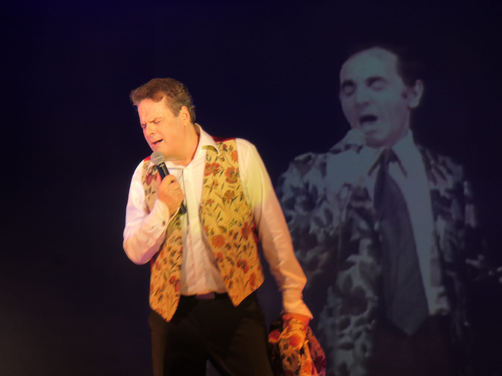 Und natürlich mit seiner charmanten Moderation, mit er er über das Leben dieses Ausnahmekünstlers berichtete. Über den Verlauf seiner Karriere, seine Wegbegleiter, seine Mitstreiter, seine Ehen. Über sein erstes Aznavour-Konzert in Nizza, und natürlich ließ er es sich auch nicht nehmen, einige Chanson-Passagen, mit Aznavour im Video auf der Bühnenrückwand, im Duett zu singen. Für einige der Chansons schrieb er neue passende deutsche Texte, so auch für „Comme ils disent“, denn die Zeiten haben sich geändert und nach all den Jahrzehnten sind die gleichgeschlechtlichen Partnerschaften von der Gesellschaft glücklicherweise akzeptiert.