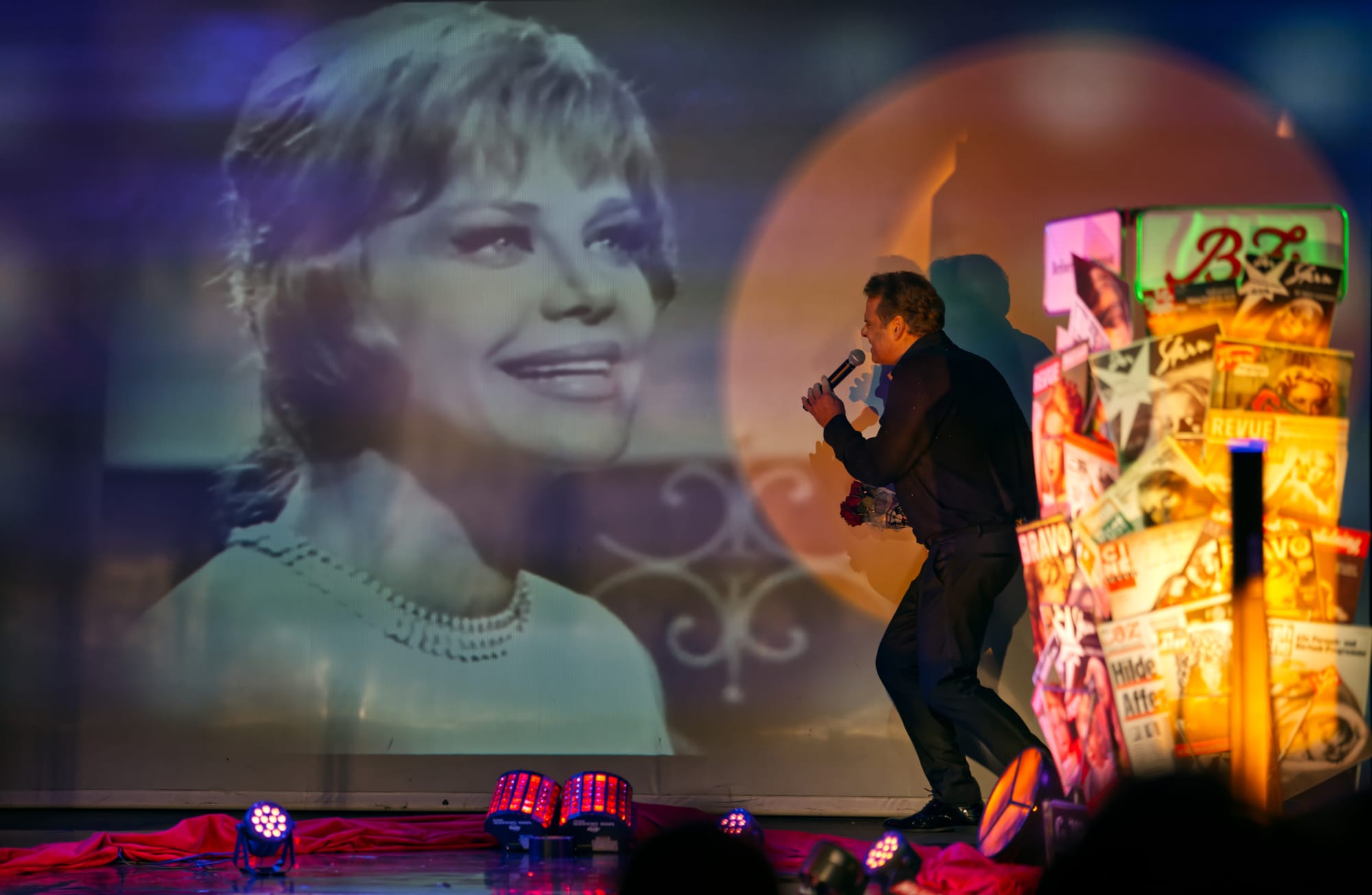 Mit authentischen orchestralen Arrangements, zahlreichen auf die Bühnenrückwand projizierten Videos aus damaligen Fernsehshows, Interviews und Konzertauftritten ließ er sie wieder lebendig werden und beim meist etwas älteren Publikum nostalgische Gefühle aufkommen. Auch ließ er es sich nicht nehmen – mit Hilde als Video-Projektion – einige ihrer Chansons als virtuelle Duette zu singen. Ein paar Scheinwerfer, ein Regiestuhl, ein Zeitungsständer mit Schlagzeilenträchtigen Illustrierten – mehr war als Bühnendekoration auch nicht nötig.