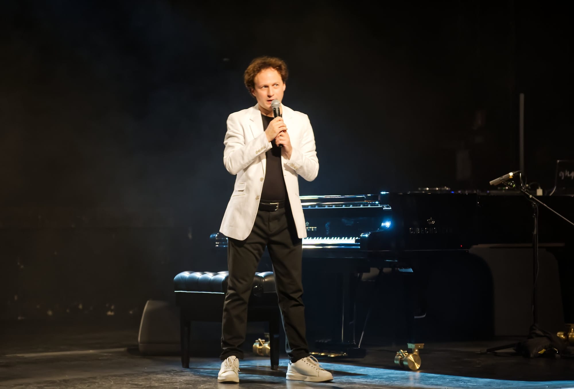 Leon Gurvitch betrat die Bühne in hellem Jackett zm donnernden Applaus des Publikums, legte sogleich los mit seiner Komposition „Silent Waves“ und versetzte seine Zuhuörer mit dieser sanft dahinfließenden Melodie sogleich in eine träumerische Stimmung, unterstrichen von einem auf die Bühnenrückwand projizierten Video hellblauer Meereswellen. In charmanter Moderation kündigte Gurvitch dann sein zweites Stück an, die heiter und fröhlich klingende „Melody from Childhood“ von seiner letzten CD „Musique mélancholique“.