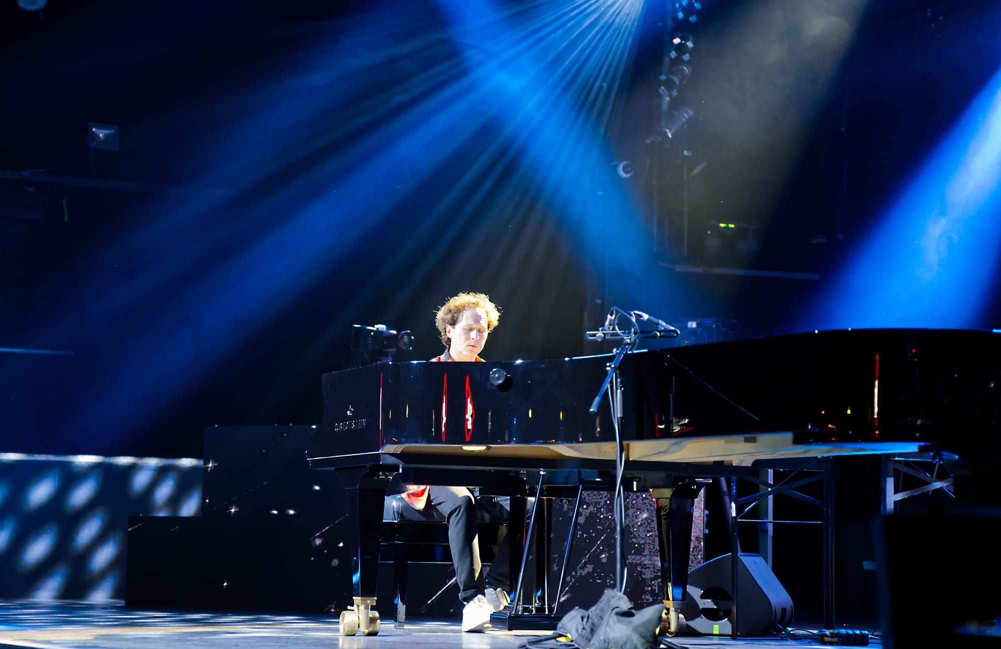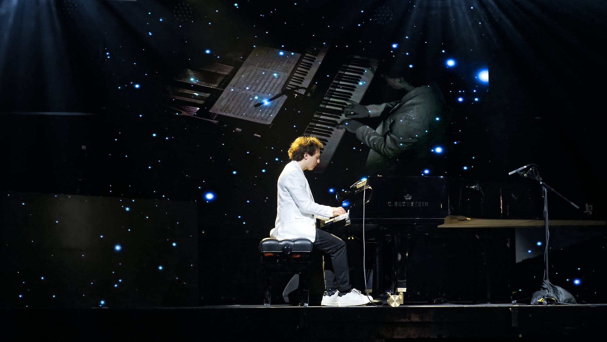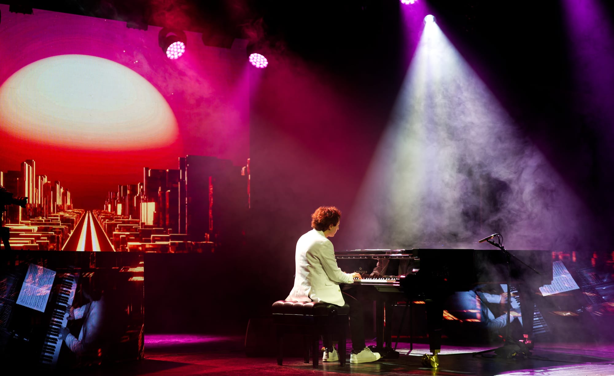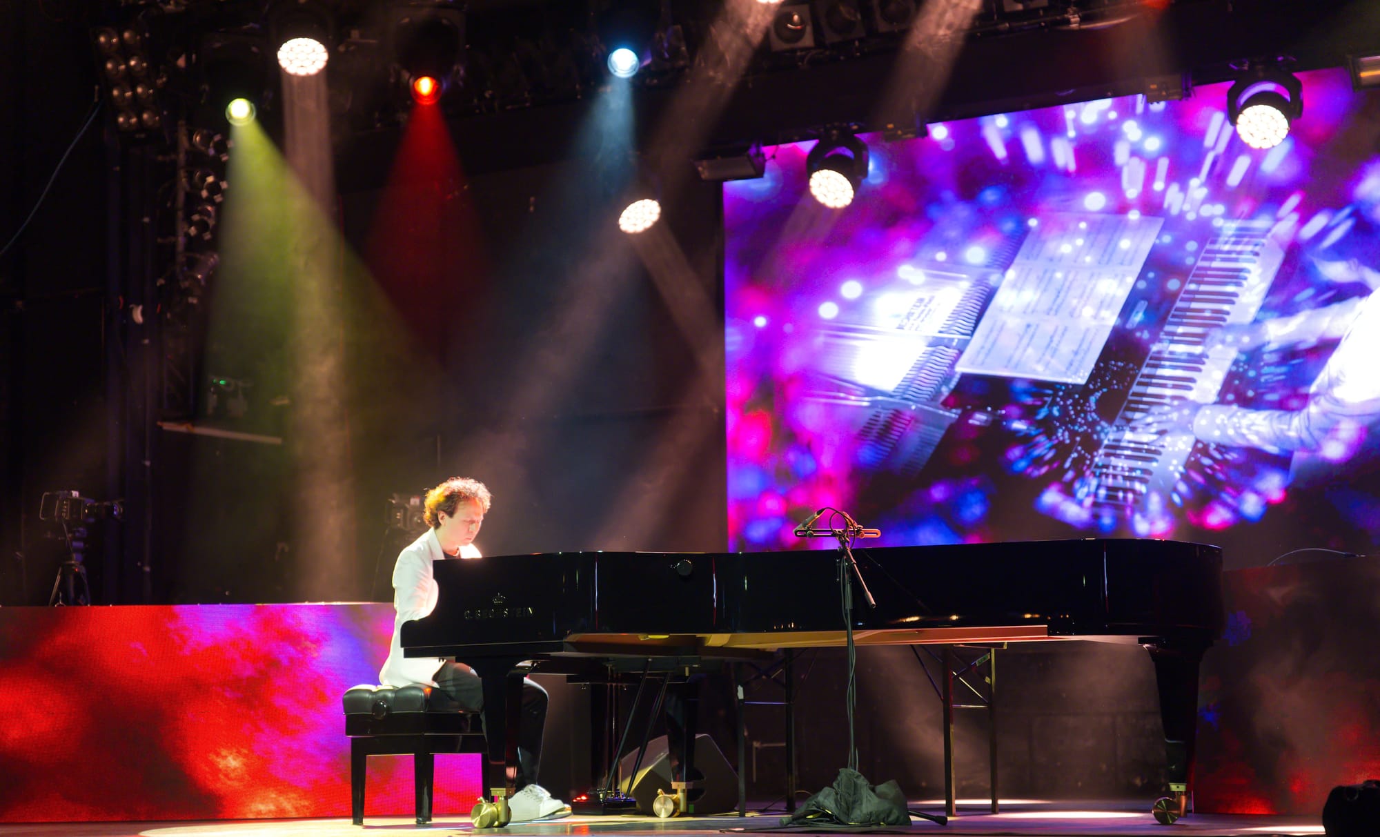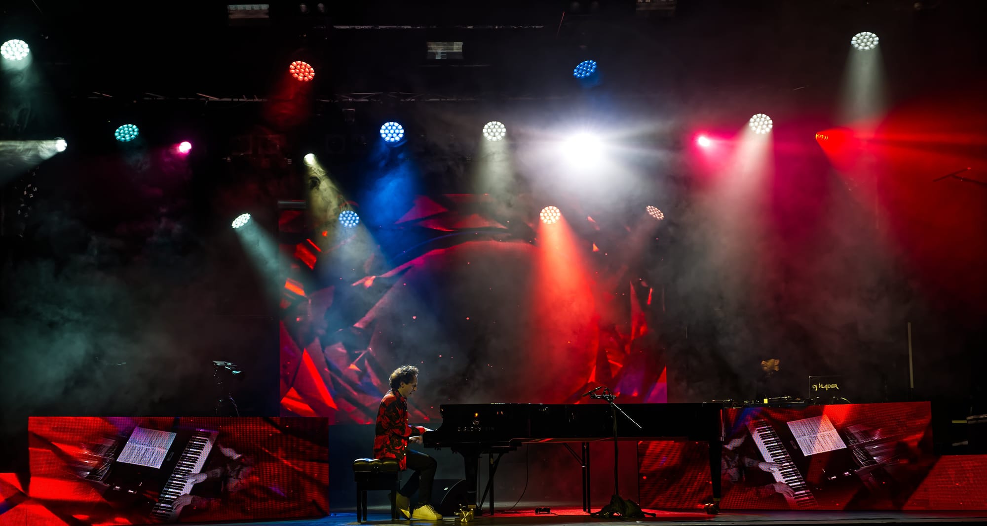 Um es gleich vorweg zu nehmen, der Abend wurde ein großer Erfolg für den sympathischen Pianisten und das begeisterte Publikum kam vollends auf seine Kosten. Nicht nur seine Kompositionen gefielen ausnehmend gut, auch die farbenfrohe, raffiniert ausgefeilte Lichttechnik und die großartigen Videoprojektionen auf der Bühnenrückwand taten ein übriges zur wunderbaren Stimmung des gesamten Abends.