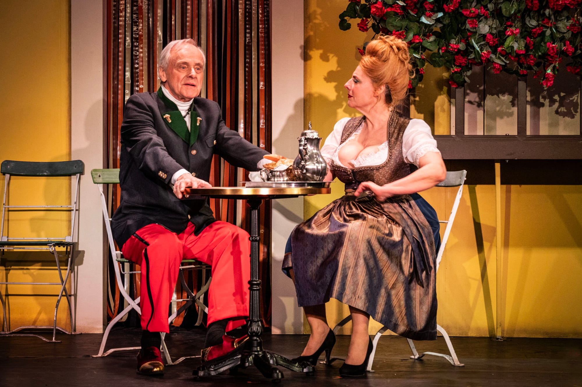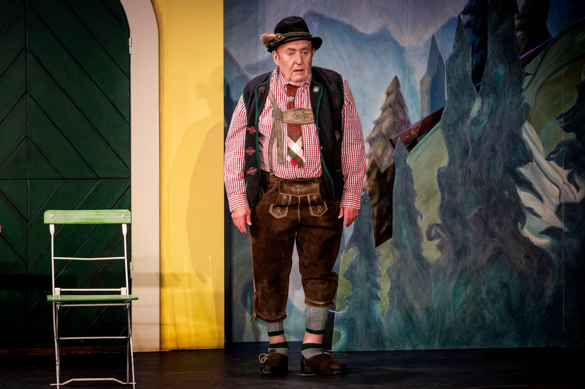 Das von Miriam Busch entworfene, praktisch und unaufdringlich wirkende, zweckmäßige Einheitsbühnenbild war die schön anzuschauende gelbe Fassade des Hotels mit dem Balkon voller Geranien, davor ein paar Bistro-Tische, dahinter die Alpenkulisse. Rechts führte ein Weg in einen angedeuteten Wald und hinauf in die Berge. Vorn blieb genügend Raum für die ambitionierten Sänger-Darsteller, die sich mit Spaß und großer Spielfreude in ihre Rollen warfen, so schön wie möglich sangen und auch manchmal knifflige Tanzschritte beherrschten (Choreographie von Susanne Hayo). Beispielsweise während des Songs „Wenn es hier mal richtig regnet“, als alle Protagonisten mit roten Regenschirmen ausgestattet ein schön anzusehendes Tanzarrangement aufführten.