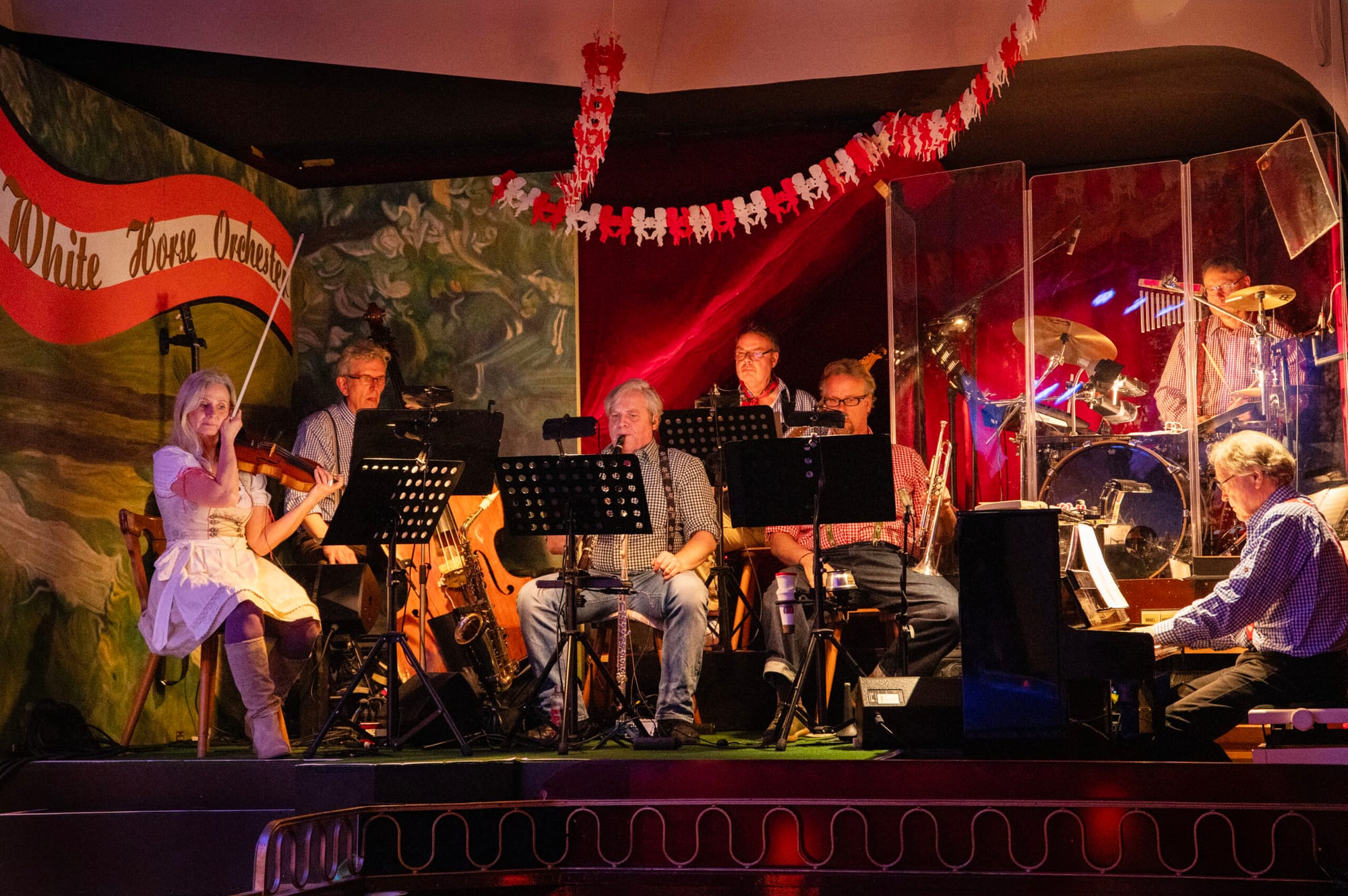 Das rechts von der Bühne in einer großen Loge platzierte siebenköpfige White-Horse-Orchestra musizierte sich detailreich durch die verschlankte Partitur und erzeugte mit temporeicher Rhythmik einen mitreißenden, temperamentvoll jazzigen, aber auch Operetten-seligen Klang. An der fröhlichen Ausgelassenheit, dem folkloristischen, alpinen Kolorit und Esprit ließ das kleine Orchester es ebenfalls nicht fehlen.