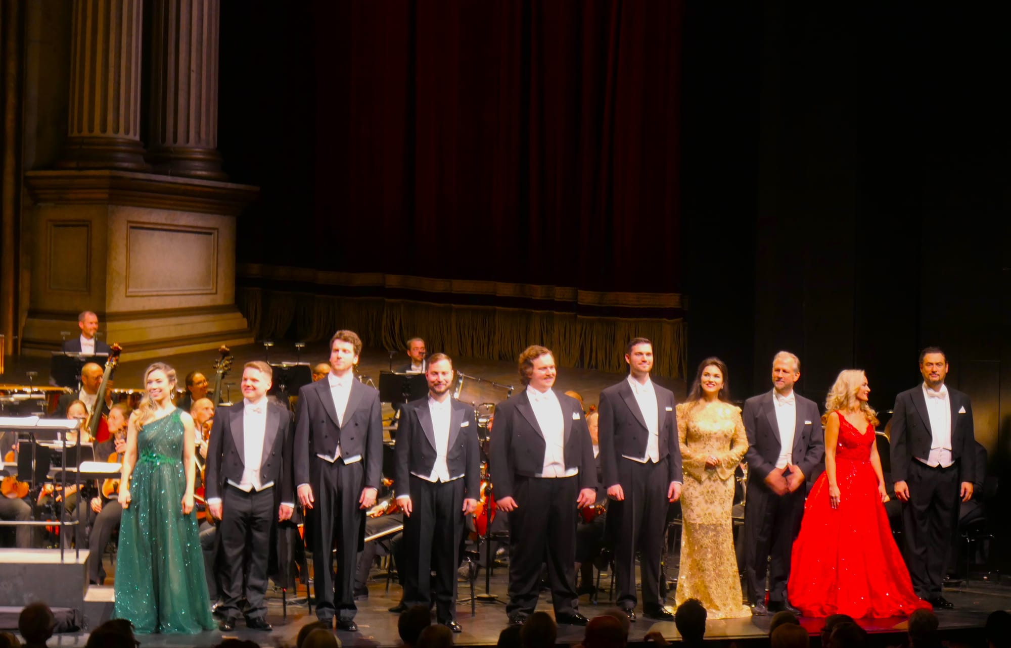 Der Abend neigte sich dem Ende zu, und als offizielle Schlußnummer präsentierte der Bass-Bariton Liam James Karai die stets wirkungsvolle Auftrittsarie des Escamillo, „Votre toast“, aus Bizets „Carmen“, zu der sich sämtliche Mitwirkenden - unsere vier neuen Kammersänger eingeschlossen - auf der Bühne einfanden und in den Refrain mit einstimmten.