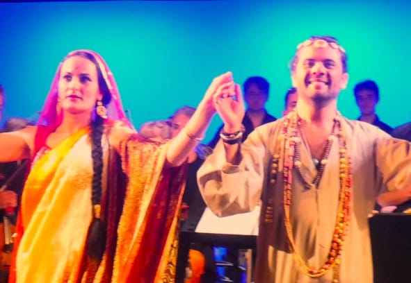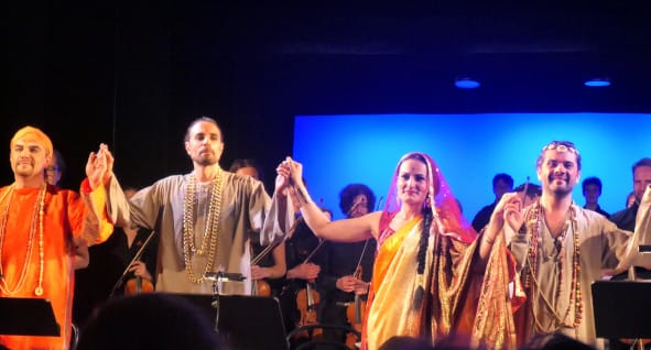 Gesungen wurde an diesem Abend vorzüglich in französisch. Die vier Protagonisten waren in indische Gewänder gekleidet, Leila in einem orangefarbenen, mit Gold bestickten Sari samt Kopfschleier, die drei Herren trugen indische Kaftans, waren mit Gold- und Perlenketten geschmückt und unterstrichen ihre Szenen auch darstellerisch mit verhaltener Gestik und dezenten Aktionen.