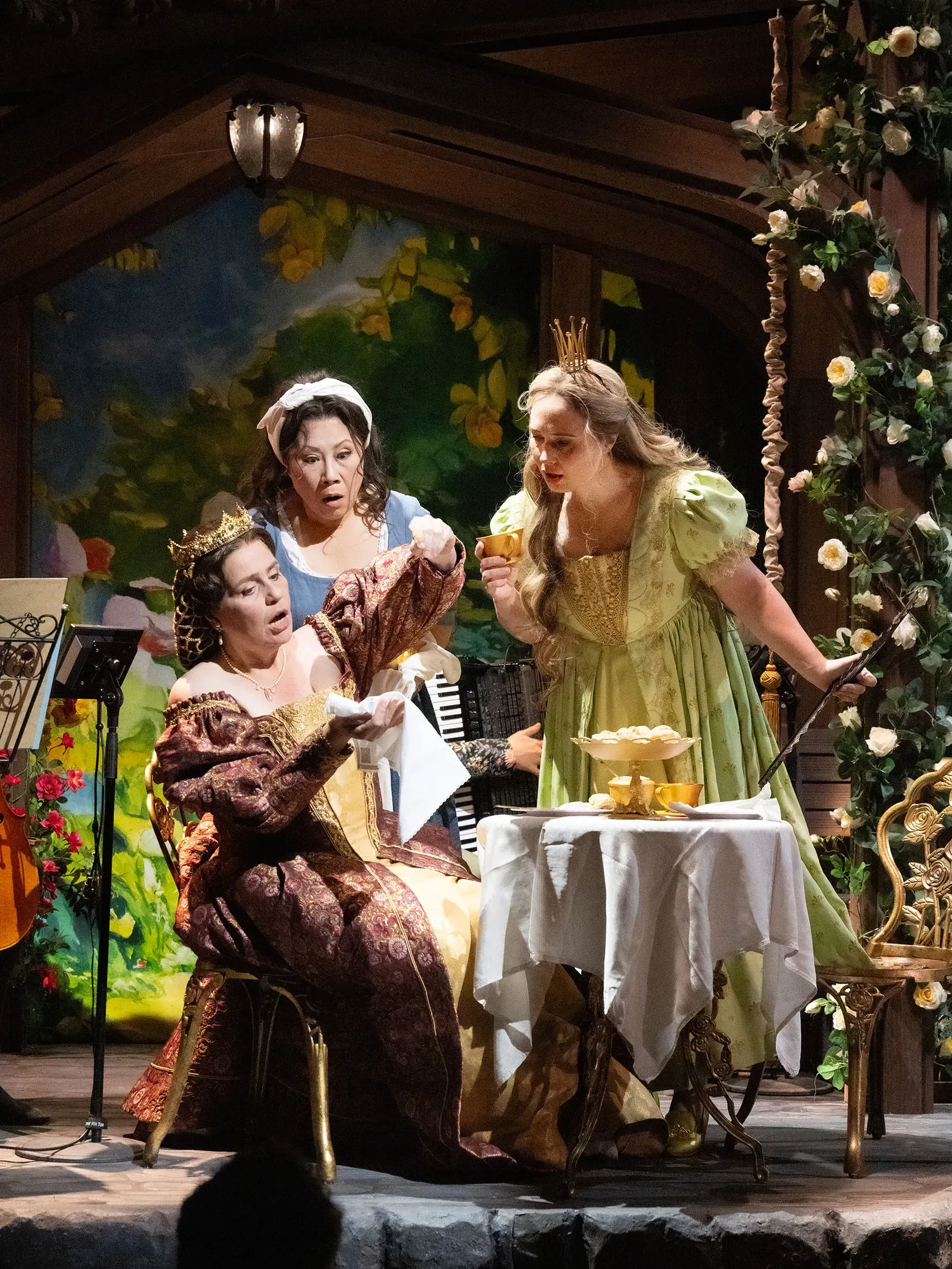 Im mit Blumen umrankten Wohnbereich der Königin und der Prinzessin waren vier Musiker platziert (Violoncello, Klarinette, Akkordeon und Keyboard) und spielten unter dem fachkundigen Dirigat von Claudia Chan. Die nicht allzu kompliziert anmutende Partitur beeindruckte insbesondere durch die sanften Einsätze der Bass-Klarinette und die düsteren Passagen des Cellos. Auch das Akkordeon und die Klaviatur konnten einige maßgebliche Akzente setzen.