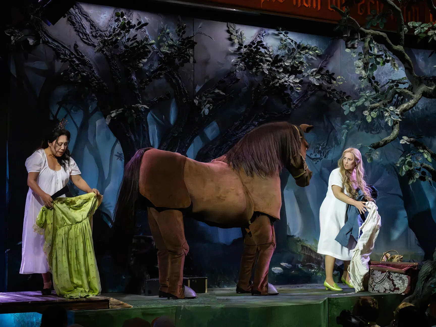 Hellen Kwon war die böse Kammerjungfrau und kostete ihren Part sowohl stimmlich mit ihrem kräftigen Sopran und den perfekt platzierten gewollt schrillen Spitzentönen, als auch in ihrer schalkhaften, temperamentvollen Darstellung der treulosen Zofe und falschen Braut genüsslich aus. Anders als im Grimmschen Märchen gibt es für sie hier jedoch ein Happy End, und zwar mit dem Koch des Königs und Schlächters des sprechenden Pferds Falada, der ihr Herz offenbar mit Salami und Nutella gewonnen hatte. Dieser Schlächter wurde gesungen und originell dargestellt von Peter Galliard.