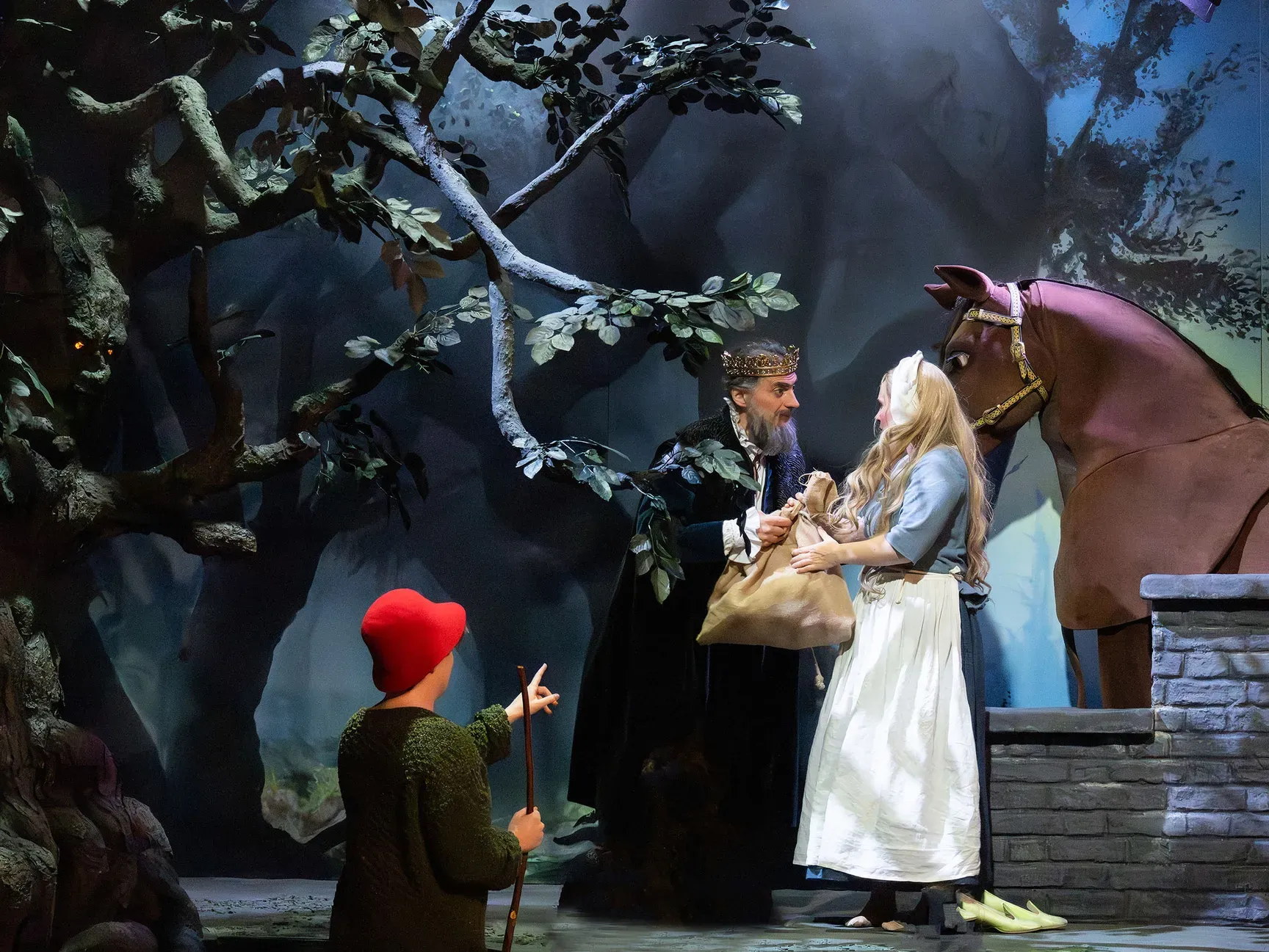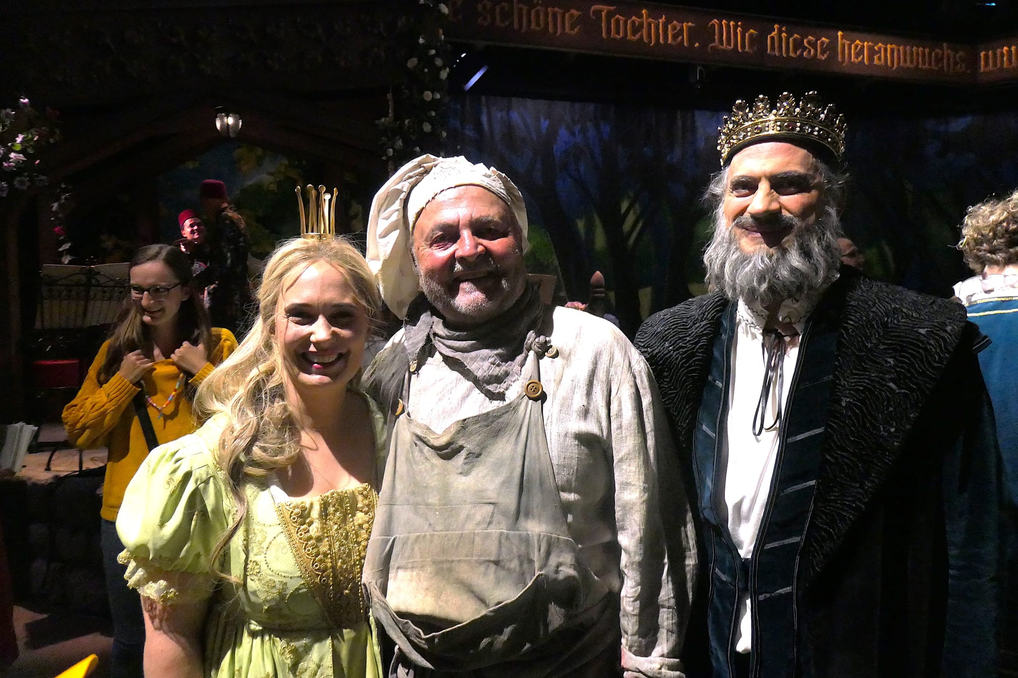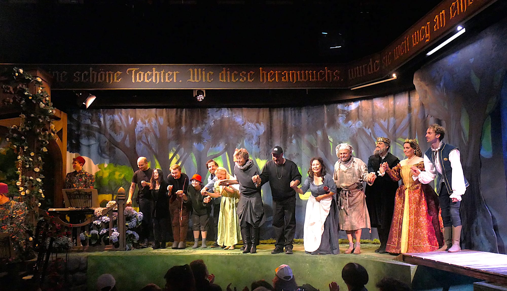 In diesem wunderschön anzusehenden märchenhaften Ambiente wurde nun fröhlich gespielt und gesungen. Zu Beginn wurden die Zuschauer vom Gänsehüter Kürdchen (Aebh Kelly) empfangen und eingewiesen. Kleine Kinder erhielten am Eingang Donald-Duck-Mützen und durften manchmal während der Aufführung wie Gänse schnattern.