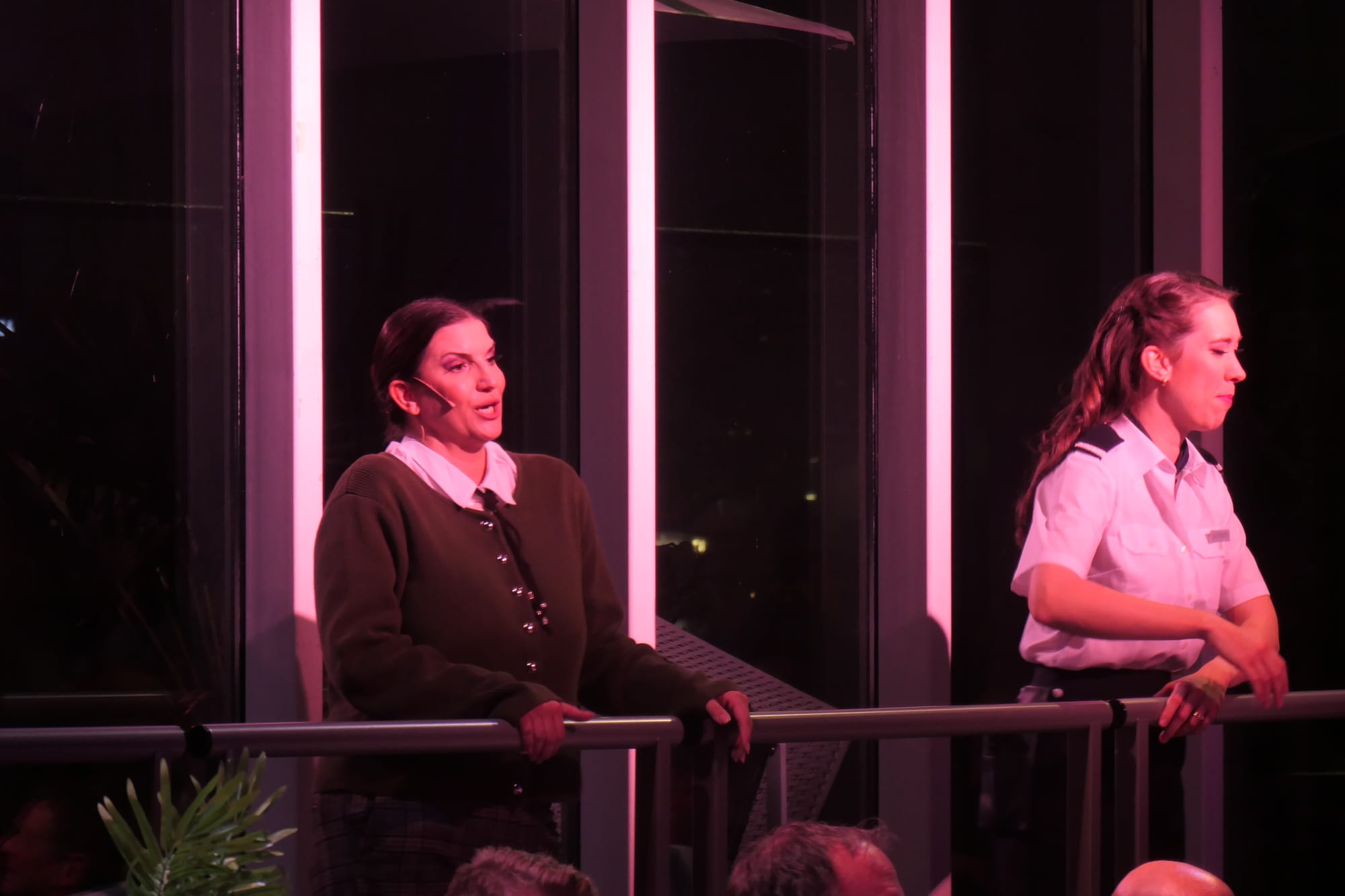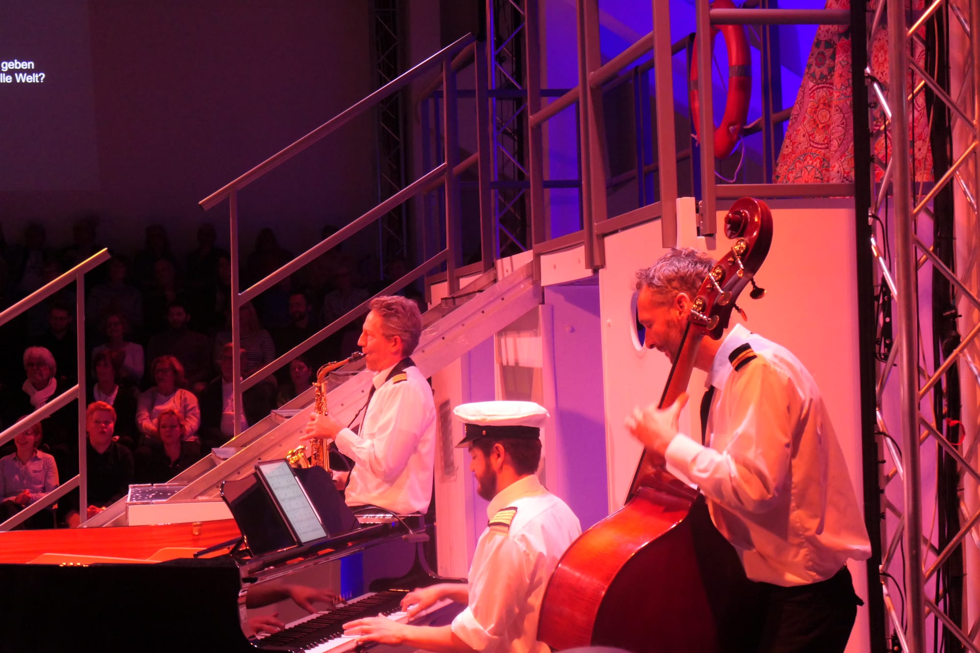 An Deck im Liegestuhl residiert die Passagierin Aline, hinter ihr ein paar Gäste als Statisten. Neben der Treppe zum Oberdeck ist die Bord-Band platziert: Esteban Ravanal als musikalischer Leiter am Klavier und Akkordeon, seine zwei Mitstreiter am Saxophon und Cello.