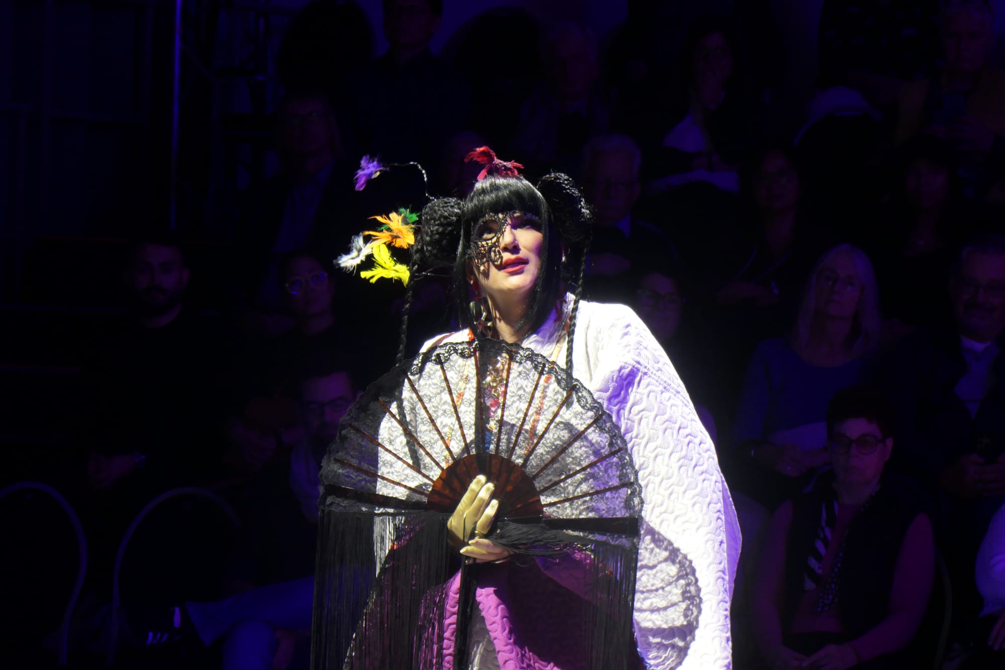 Freddy mit seiner hohen Baritonstimme überraschte die Zuhörer im zweiten Teil mit einem durchaus gelungenen „Nessun dorma“, während Aline nun als Show-Act in einem üppigen Geisha-Kostüm in die Rolle der Cio-Cio-San schlüpfte, ein wunderschönes, innig empfundenes „Un bel di vedremo“ sang, gefolgt vom Blumenduett gemeinsam mit Jasmin, in dem beider schön timbrierten Stimmen wiederum zu reinstem Wohlklang verschmolzen, und Butterflys Todesarie „Tu, tu, piccolo iddio“.