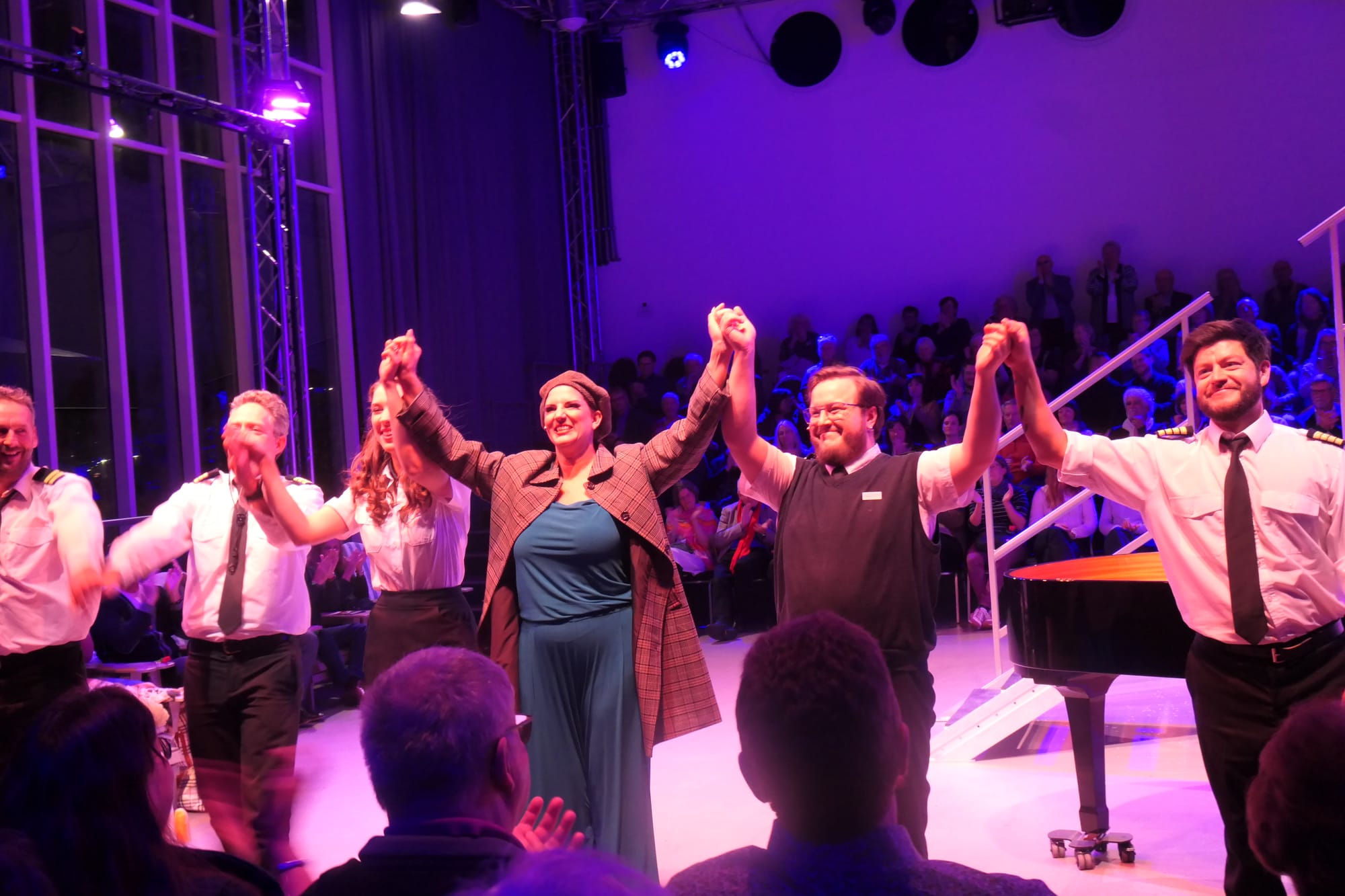 Den Abschluß bildete dann der von allen gesungene Klassiker „Red Sails in the Sunset“, zu dem das begeisterte Publikum im ausverkauften Opernloft die drei Sänger Aline Lettow, Jasmin Désirée Schaff und Frederik Essunger für ihre eindrucksvollen gesanglichen, darstellerischen und auch tänzerischen Leistungen feierte und auch die drei Musiker in den Schlußapplaus mit einbezog.