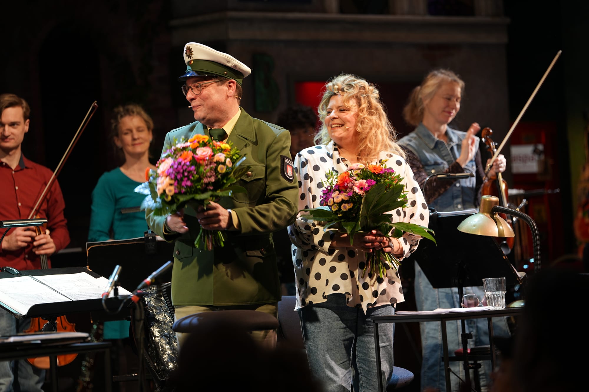Auf der im typischen Rotlicht-Milieu dekorierten Bühne waren die knapp 20 Mitglieder des bestens disponierten Orchesters platziert. Eingebettet in Prokofjews Märchenkomposition fungierte Axel Brüggemann in grüner Polizei-Uniform als Erzähler dieses Pinzner-Dramas. Und die Sängerin und Entertainerin Caroline Spieß als Pinzners Ehefrau Jutta in üppiger weißer gepunkteter Bluse mit heller Stimme in kindlich-naivem Tonfall hielt - quasi aus dem Jenseits - Zwiesprache mit ihrem „Mucki“, ihrem „Geilo“, ihrem Beschützer, der auch sie so einfach „weggemacht“ hatte, und die sich jetzt fragte, ob er sie denn überhaupt wirklich geliebt habe. Sie erzählte, wie sie sich um Biggi kümmerte, Pinzners Tochter aus seiner ersten Ehe mit Elfi, einer Prostituierten. Sie erzählte von seinem „Mandelhörnchen“, von ihrer „Honigfalte“, und wie toll das 'Liebe machen' mit ihm immer gewesen sei.