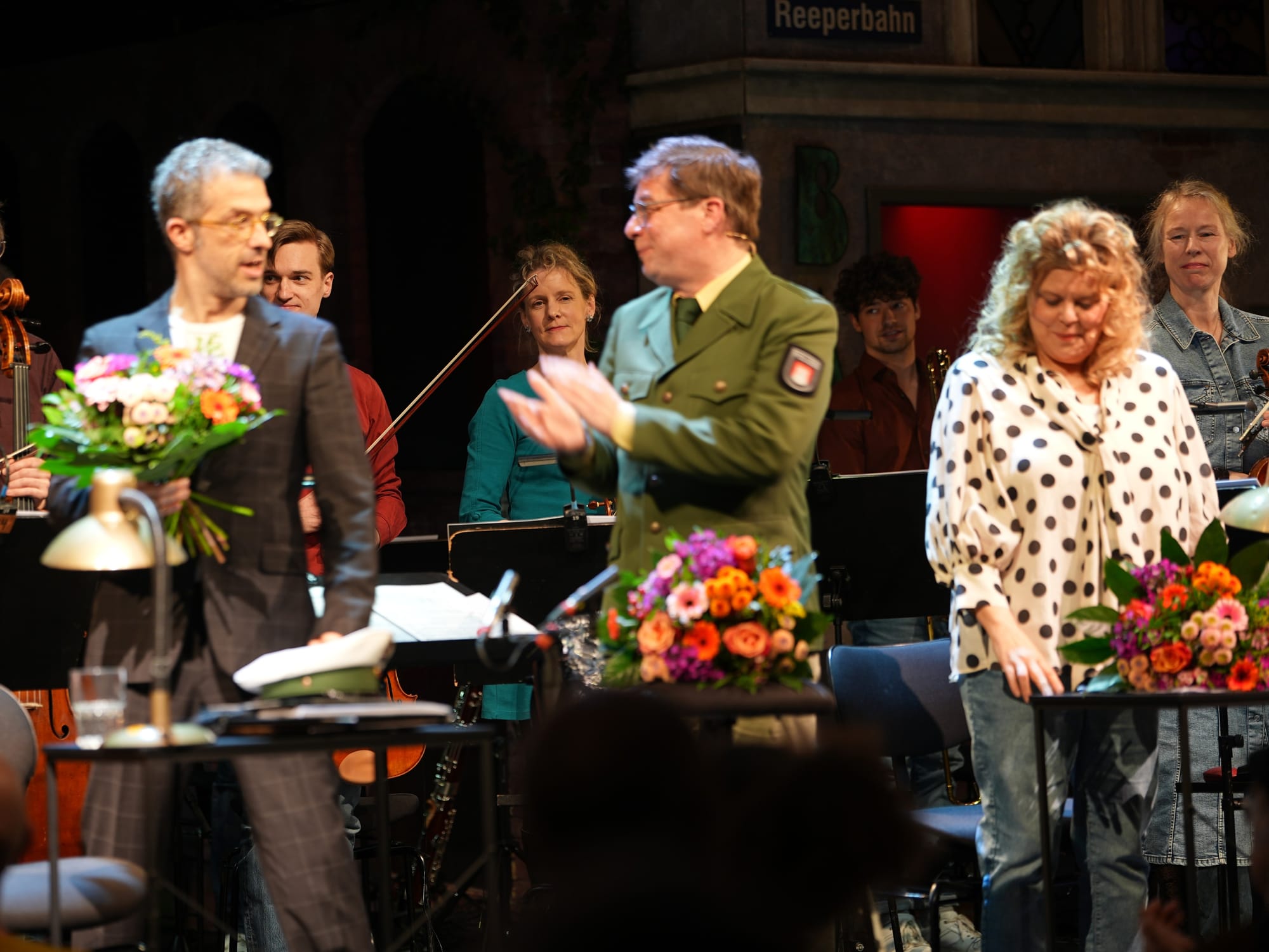 Nun ist Prokofjews „Peter und der Wolf“ kein abendfüllendes Stück, und diese kleine, kindgerechte Märchenerzählung will eigentlich auch nicht so richtig zu einem St.Pauli-Krimi passen. Und so wurde das Ganze aufgepeppt mit Pop-Klängen aus den 1980er Jahren. Eröffnet wurde der Abend mit „Samba pa ti“ von dem mexikanischen Musiker Carlos Santana, weil Mucki und Jutta den Santana so toll fanden. Einige 1980er Pop-Songs wurden als bombastische Ouvertüre des zweiten Teils gespielt: das „Star Wars“-Thema, Tina Turners „What's Love got to do with it“, Queens „I want to break free“, Van Halens „Jump“, Michael Jacksons „Thriller“. Oder, wo es gerade ins Narrativ paßte, ein Song wie „Touch me“ von Samantha Fox. Auch steuerte Omer Meir Wellber auf dem Akkordeon „Das Herz von St.Pauli“ und „La Paloma“ bei. Aber es gab auch Händel-Passagen, und zu Juttas Monologen erklang Schuberts „Tod und das Mädchen“. Ein Höhepunkt war jedoch der von Caroline Spieß herzzerreißend vorgetragene Song „Jenseits von Eden“.
