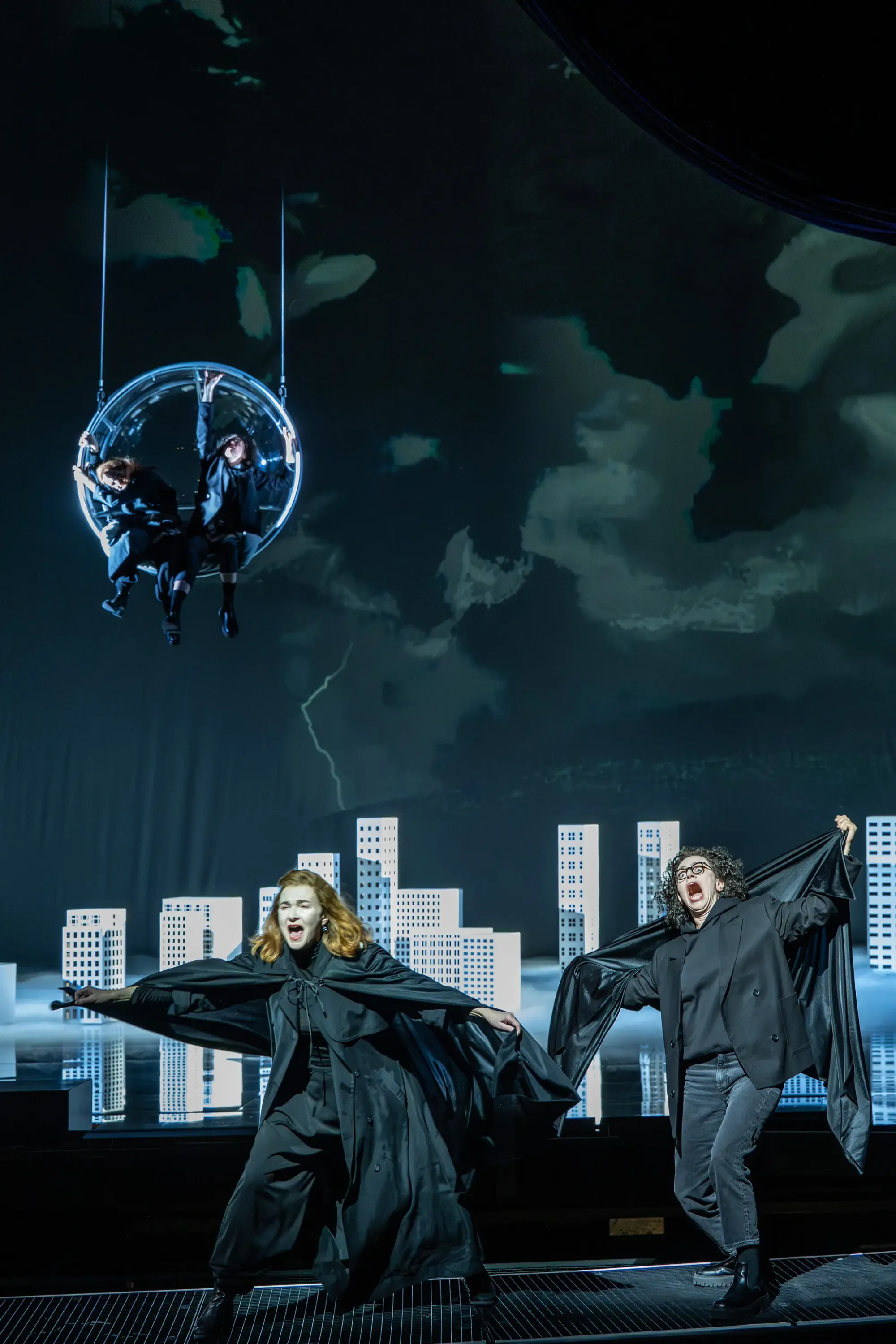 Sarah Defrise als Vampi und Kristina Stanek als Bampi überzeugen mit vokaler Intensität und schauspielerischer Hingabe. Georg Nigl verschmilzt vollendet mit seiner koloraturenreichen überaus fordernden Rolle als König-Präsident. Anna Clementi gibt Gorgonzilla auch eine betörend menschliche Stimme.
