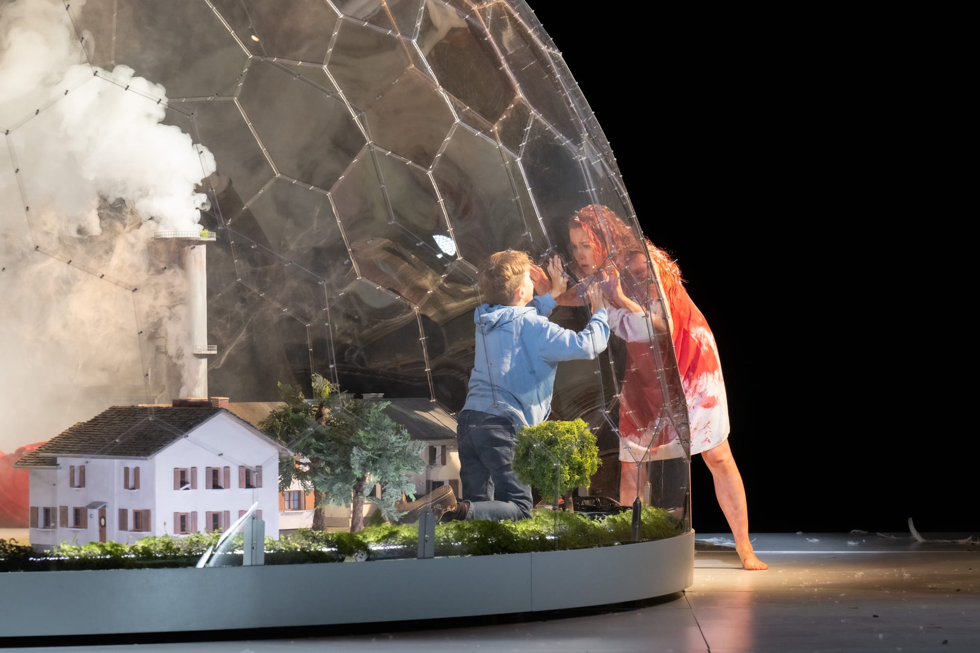 Jeder Teil trägt in sich den Tod – entweder durch Krieg, Seuche oder Umweltzerstörung. Tobias Kratzer setzt Schumanns Werk als Miniaturmalerei dieser Krisen um. Stets ist auch das Publikum betroffen. Die Frau, die den Saal verlässt, will nicht sehen, dass die Peri mit Blut übergossen wurde, weil das nicht in die Oper gehöre. So verneint sie die Wirklichkeit, erinnert an die letzte Hamburger Trovatore-Premiere mit ihren Buhrufen nach der Vergewaltigungsszene und verneint die Toleranz für Kratzers Bilder, die das Werk erläutern sollen. Sie und der schlafende Zuschauer sind Symbole der Intoleranz.